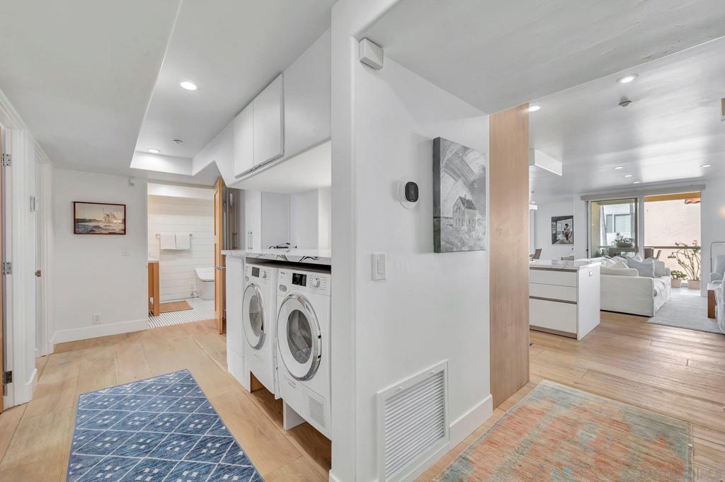 Remodeled and picturesque contemporary beachfront residence at 202 Coast in the heart of The Village. This single-level 3-bedroom, 2.5-bath condo blends sophisticated coastal design with everyday comfort—ideal as a primary home or a vacation retreat. Thoughtful upgrades include premium appliances, custom cabinetry, motorized window treatments, central A/C and heating, and beautifully renovated baths. Step directly onto the sand, enjoy panoramic ocean breezes, or walk to La Jolla’s top restaurants, boutiques, galleries, and cultural attractions. Includes two garage parking spaces and abundant storage. Ready to live in, lock-and-leave, or make it available for long-term rental.