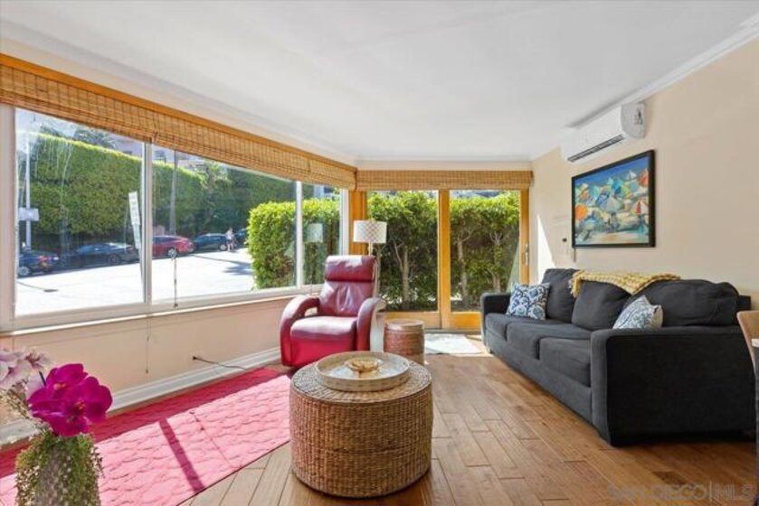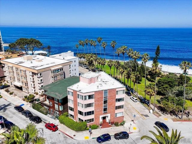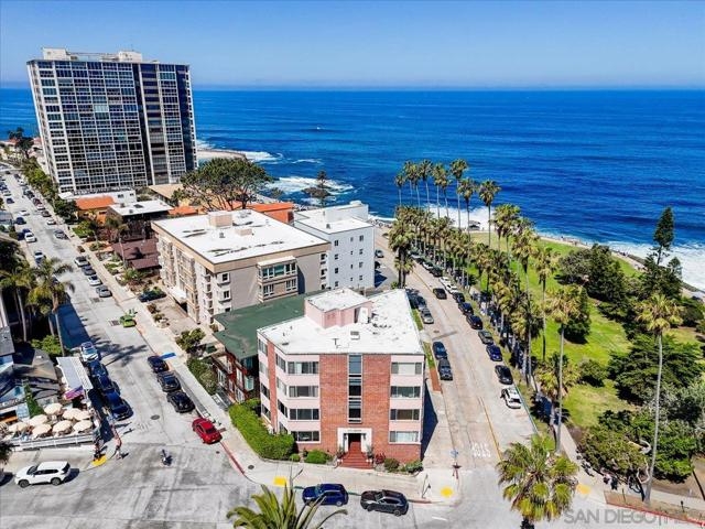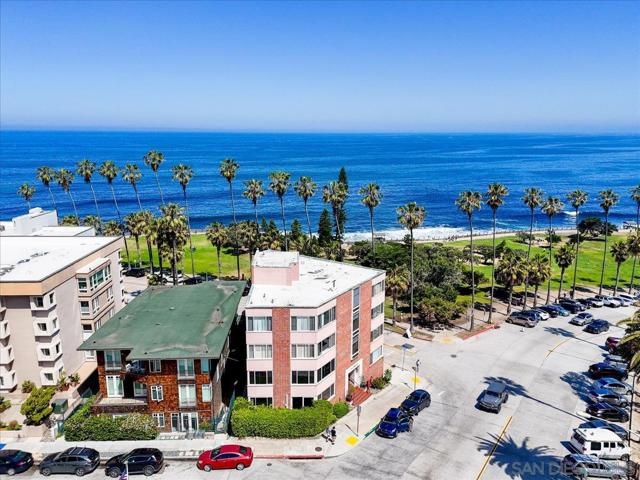 Spectacular location, in the heart of La Jolla Village, this perfectly situated, first floor condominium is just steps from renowned restaurants, boutique shops, world class art galleries and a multitude of coastal attractions. Stepping inside the architecturally unique, curvilinear entry way you are immediately greeted by the open concept living, dining, kitchen, great room with sliding doors that lead you to the common patio/garden space, surrounded by tall ficus trees for privacy. Living space features wall-to-wall picture window to enjoy your quintessential La Jolla coastal views, including the iconic La Valencia Hotel, and the classic palm tree lined Coast Walk that graces Ellen Browning Scripps Park, all of this plus views of the blue Pacific Ocean all the way up the coast past the bluffs of Blacks Beach. Large windows in each room let in the natural sunlight . Hardwood flooring in the main areas and carpet in the bedrooms. Kitchen features stainless appliances, dual corner sinks, electric stove, and spacious pantry. Stacked washer and dryer in unit. 2 mini-split systems for immediate cooling and heating, and an additional 3 ceiling fans. Don't pass up this opportunity to be on a vacation 24/7, 365 days a year! Seller will pay for one year's parking in La Jolla. See attached 24hr parking locations.