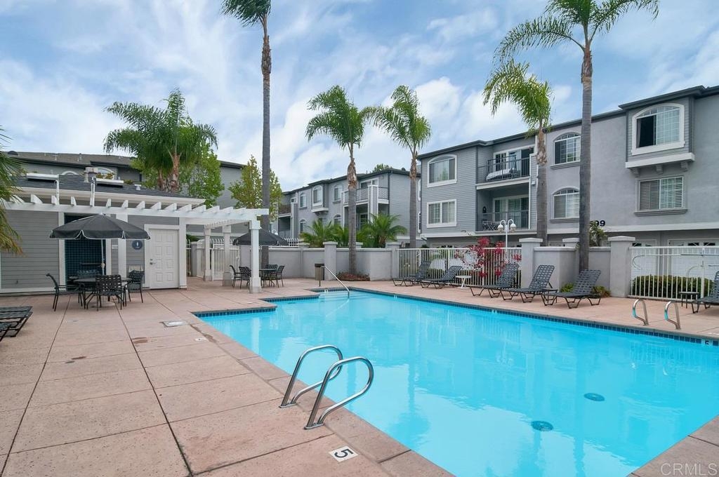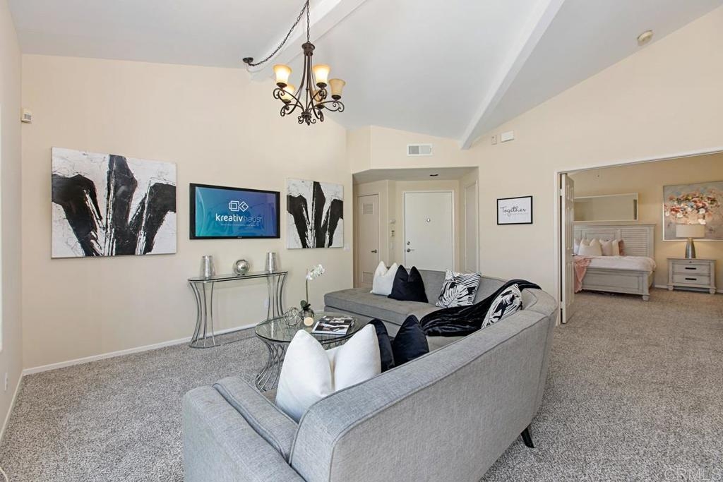 Perfectly located top floor unit facing east located near shopping, freeways and UCSD. Move right into this pristine, impeccably cared-for upstairs unit with grand 12 ft cathedral ceilings, remodeled kitchen and baths with newer appliances. Second bedroom is a perfect secondary master suite with a walk-in closet and large windows. There are two private garages with extra storage room. Complex offers ample guest parking close to unit and resort style pool and spa.