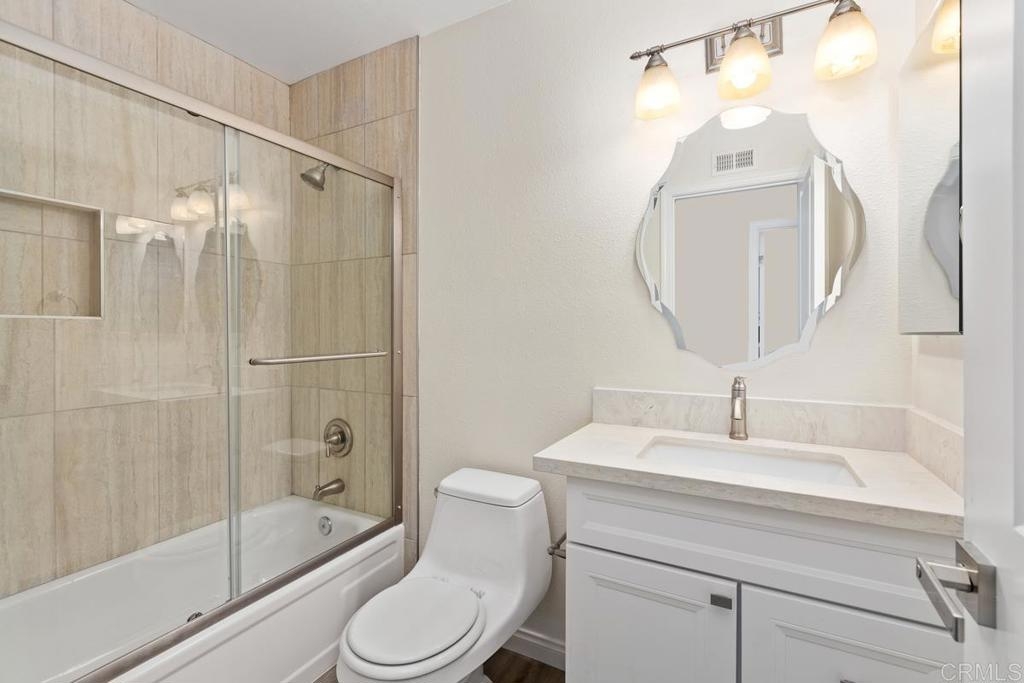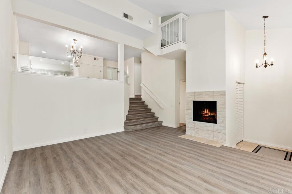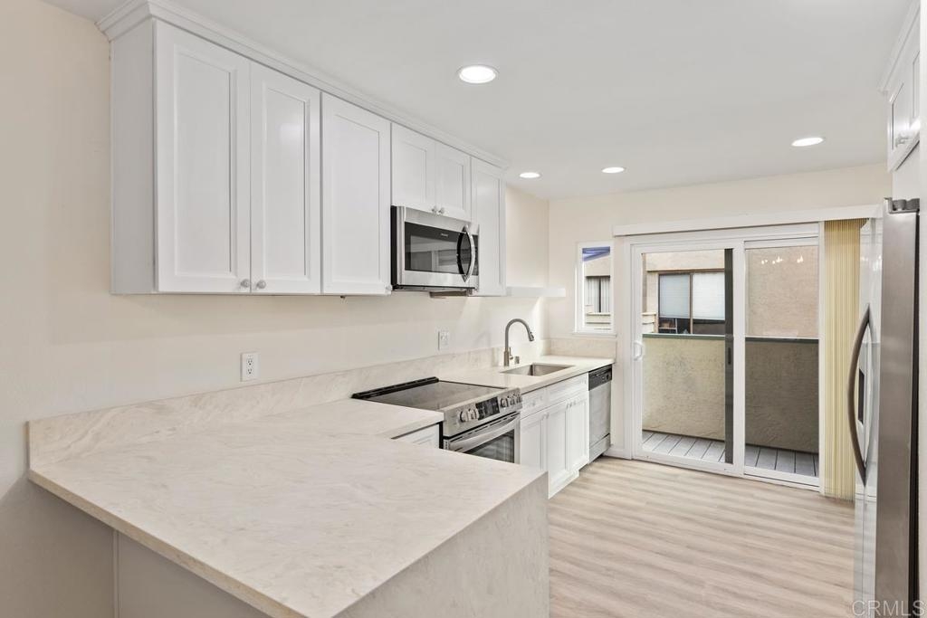 Turnkey home in the community of La Jolla Village in Eastbluff, end unit with ideal floor plan and immense natural light which rarely comes on the market. Complete remodel with luxury high impact vinyl flooring throughout, Milgard Tuscany dual pane energy saving windows and sliding doors, all doors and frames. Elegant ground level entry leads into a spacious living room with cathedral ceiling, newly remodeled gas fireplace, large sliding door opening into a cozy private patio. Remodeled dining/kitchen/family level to a newly installed kitchen with new Frigidaire stainless steel oven/range, refrigerator, microwave, pantry and waterfall quartz countertops. Bathrooms remodeled with vanities, upscale tiles, enclosed showers, faucets and plumbing connections and accessories. Two bedrooms and full baths on the 2nd floor and a third bedroom and half bath on the upper level. Spacious epoxy painted 2-car attached garage with washer and dryer. Walk out to a serene, huge, dog friendly neighboring park, two community pools, gym and clubhouse. Convenient, easy access to Hwy 5 and 52, short distance to shopping, dining, Whole Foods, Trader Joe’s, and many other restaurants and shops.