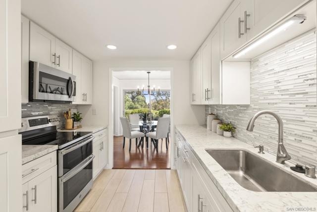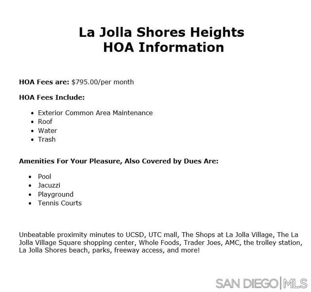 This exceptional remodeled La Jolla home is unlike anything else that’s currently available on the market. If you’re looking for something special, this is the perfect home for you. Offering multiple expansive living areas including an inviting living room with fireplace, a completely separate family room, dining, and breakfast area. There's three entertaining outdoor spaces, OWNED solar (two years old), brand new roof coming soon, and two car garage PLUS an extra parking space designated for this home. Experience seamless indoor-outdoor living with a serene greenscape backyard showcasing treeline and mountain views off the spacious living room/breakfast area. A charming private patio extends from the family/dining room. The beautifully remodeled kitchen highlights modern finishes, abundant cabinetry, pantry storage, and stainless steel appliances. The generous primary suite features high ceilings, walk-in closet, and a brand-new remodeled ensuite bath. You also have an oversized upstairs deck off the primary suite overlooking lush greenbelt scenery. The second and third bedrooms also feature high ceilings and offer lovely forest and city views, bringing natural light and tranquility into each space. As you meander through the treelined/wooded community the homeowners of La Jolla Shores Heights have access to a pool, tennis court, and playground. Unbeatable proximity minutes to UCSD, UTC mall, The Shops at La Jolla Village, The La Jolla Village Square shopping center, Whole Foods, Trader Joes, AMC, the trolley station, La Jolla Shores beach, & parks.