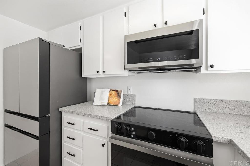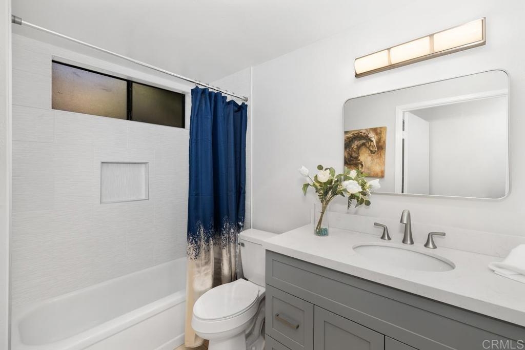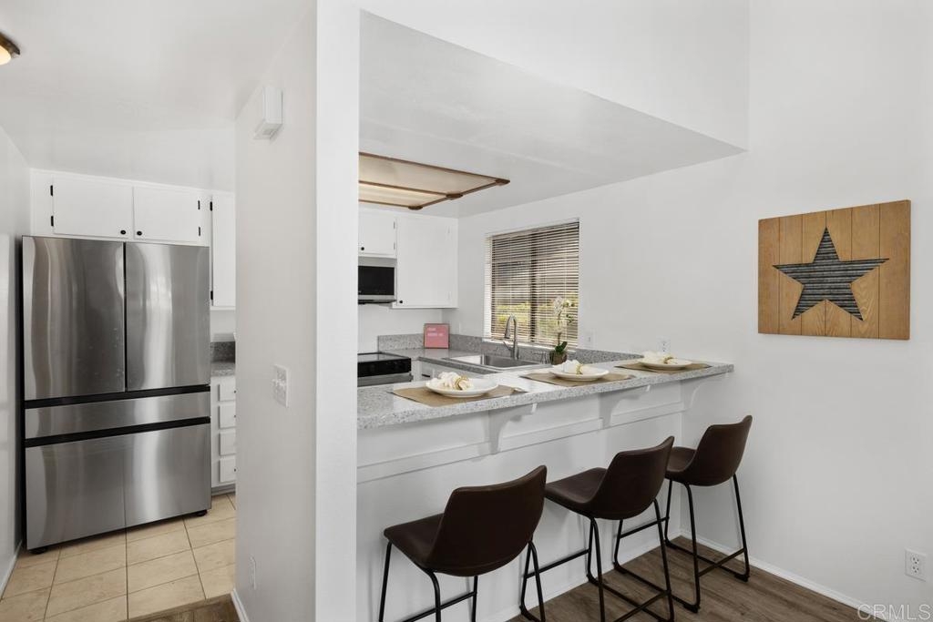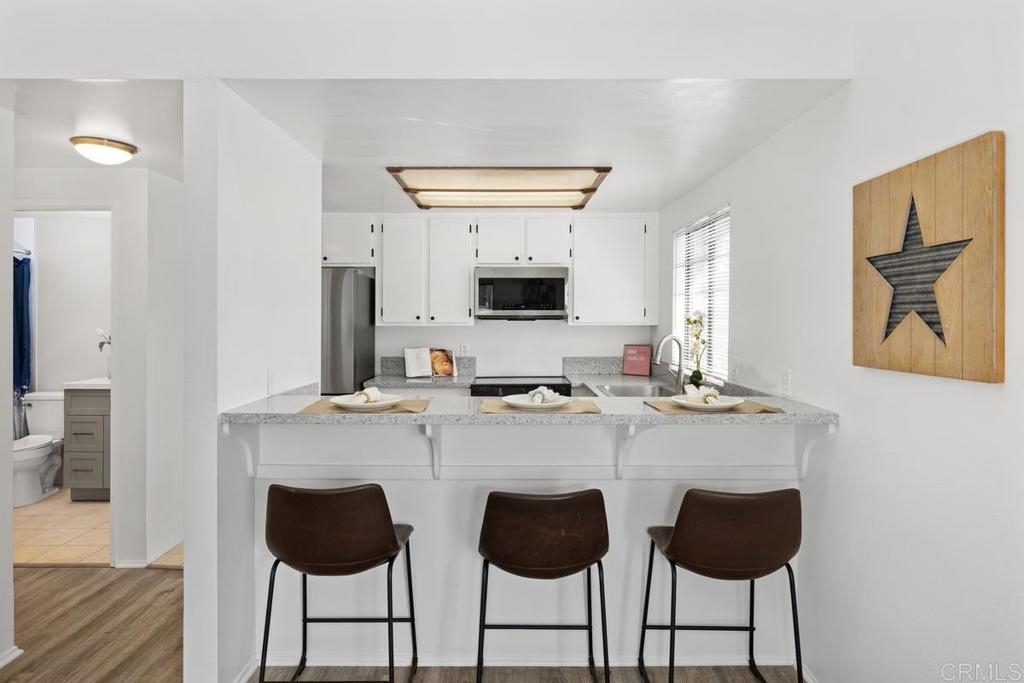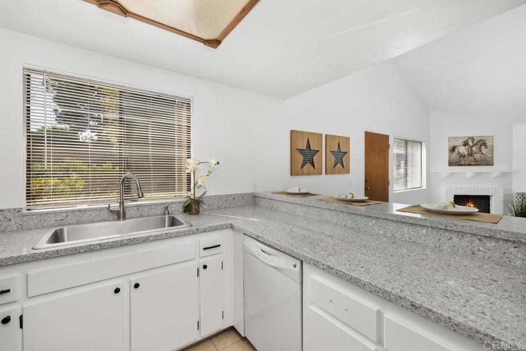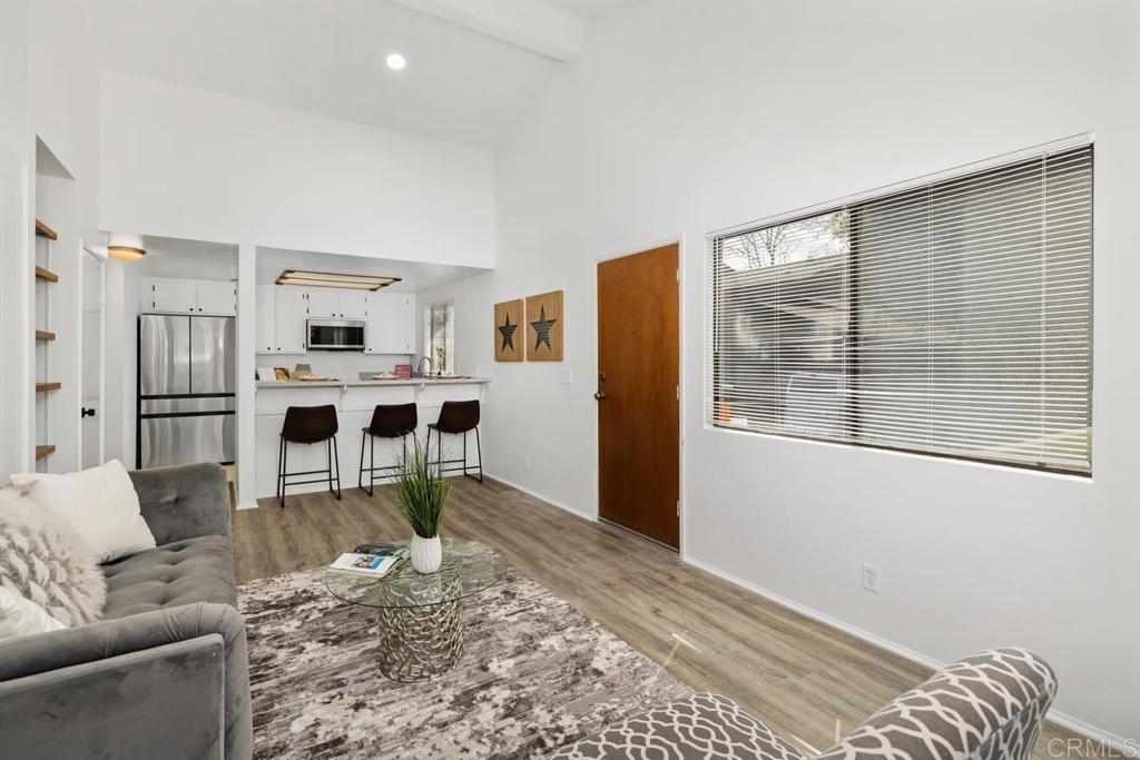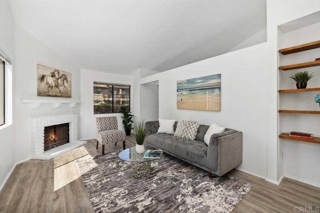 Charming single level, end unit with no stairs, cathedral ceiling and lots of windows letting in natural sun light, quiet location with no one above or below you. This freshly painted unit is ready to move in with remodeled kitchen featuring all new stainless steel appliances, including new stove, microwave, dishwasher, sink, and refrigerator. New quartz countertops and bar that opens into living room with fireplace and new scraped and textured ceilings. The bedroom has a huge walk-in closet and new sliding door leading to private patio. Bathroom has just been remodeled also. Washer and dryer are in the unit and are included. Attached covered carport for easy parking. Complex has a pool and spa. Incredibly convenient location just west of the 5 with easy freeway access, minutes to beaches, and a plethora of shops and restaurants only blocks away including, Whole Foods, Trader Joes, Nordstrom Rack, BJ's., the Nobel Trolley Station, UCSD, VA, and the list goes on and on. This is the opportunity you've been hoping to find.