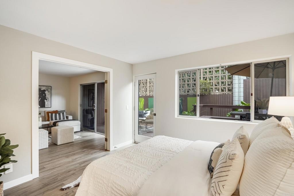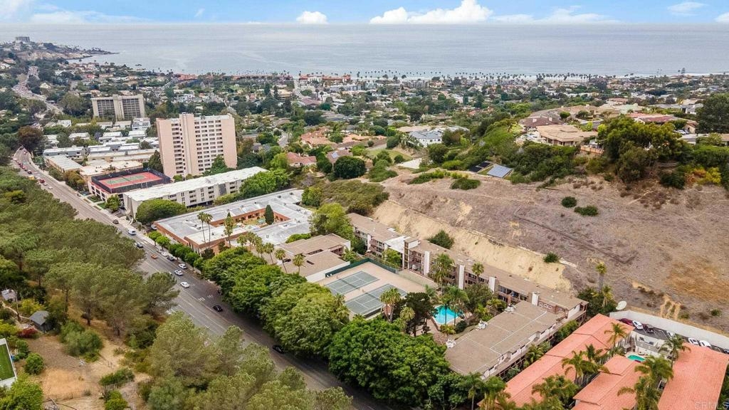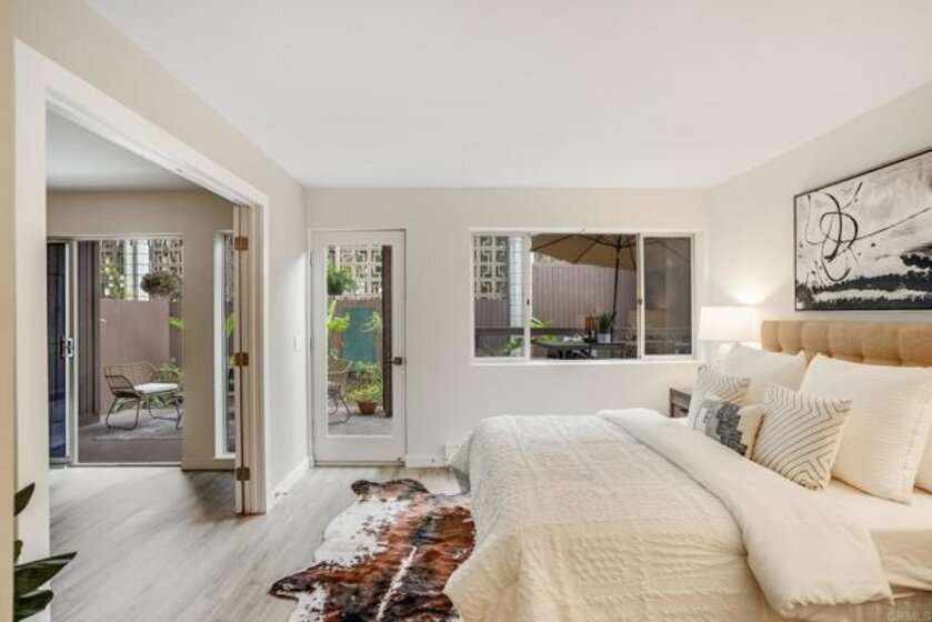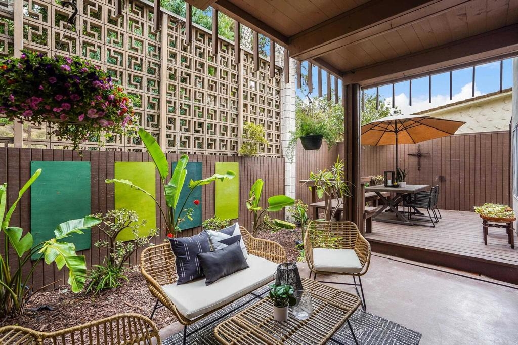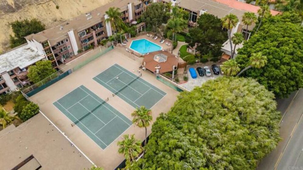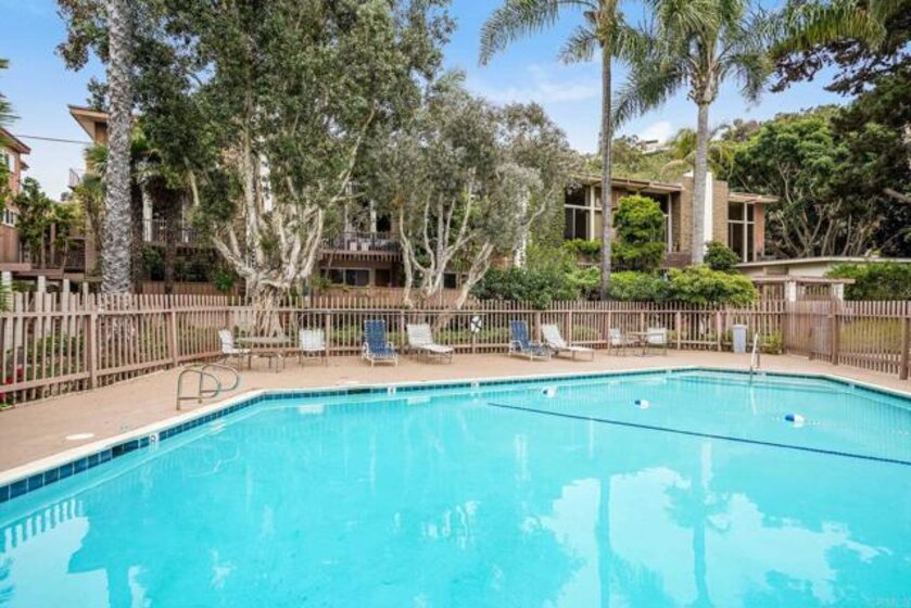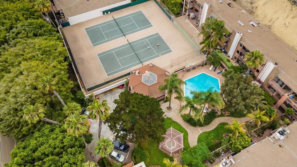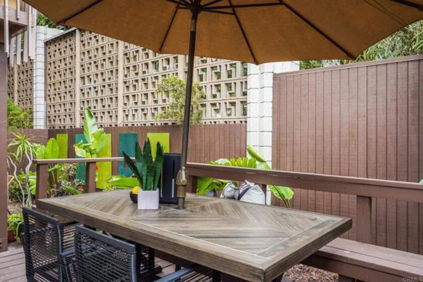 ICONIC MID CENTURY ARCHITECTURE…. The swinging HOT SPOT in the late 60's/70's, still TIMELESS today! Literally 1 mile to beach! FIRST TIME ON MARKET…OPEN BRIGHT SMASHING REMODEL! PRIVATE ground floor SINGLE LEVEL END UNIT! …One of a Kind location with PRIVATE wrap around YARD Featuring a covered patio, a sunny deck and sideyard ideal for a dog run. … French Oak Flooring throughout, Custom Paint & Trim……All NEW SUNNY AND WHITE Kitchen…… Sparkling QUARTZ counters, SHAKER cabinets, ALL NEW STAINLESS APPLIANCES, canned dimmer lighting …..Built in BREAKFAST/COFFEE BAR plus built in WINE BAR or ENTERTAINMENT BUFFET at spacious DINING AREA……HUGE LIVING AREA with oversized sliders to outside... BEDROOM 1 opens w/Double Doors allowing long look lines to Living Area, Glass Door to patio, and oversized window…. Smaller.....10' x 7' .....BEDROOM 2 is set up as OFFICE (no closet but room for) w/double door views to two garden areas ….TRANQUIL BATH: NEW Tavertine look porcelain tiled walk-in shower w/ marble stone floor, Vanity and wall heater. Bathroom can be separately accessed from Bedroom 1 OR Living Area..… INSIDE Stackable Washer dryer hookup, NEW efficient electric baseboard heaters, Gated covered Parking Space. LJRC Pool, Spa, Tennis Courts, Wellness/workout Center, ClubHouse. This is a V E R Y UNIQUE unit at La Jolla Racquet Club. Ready for summer fun now!