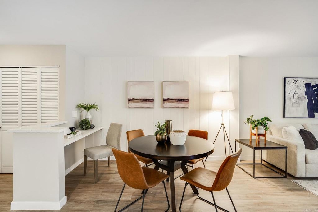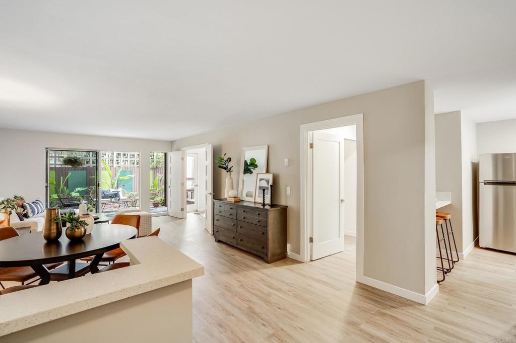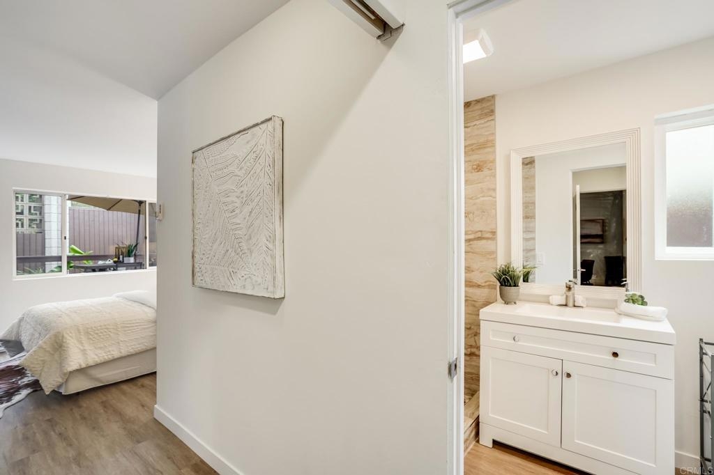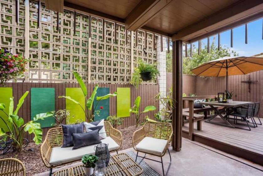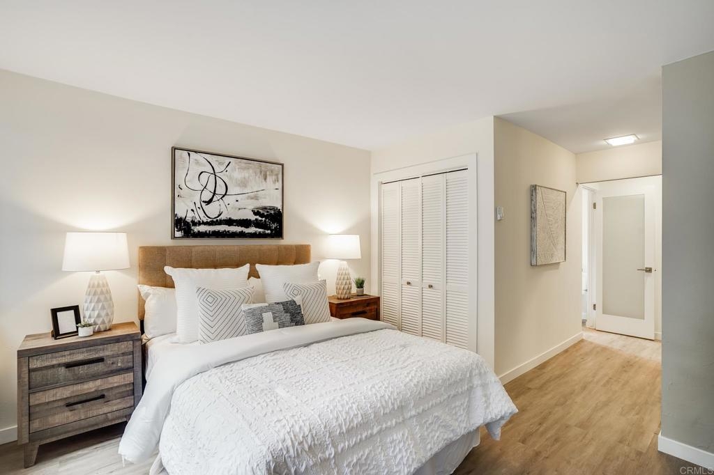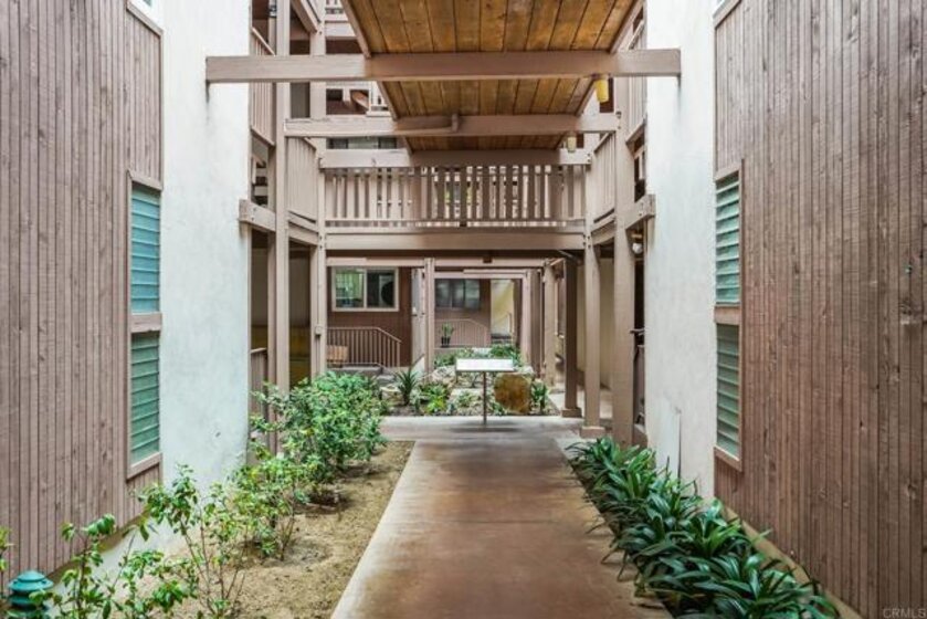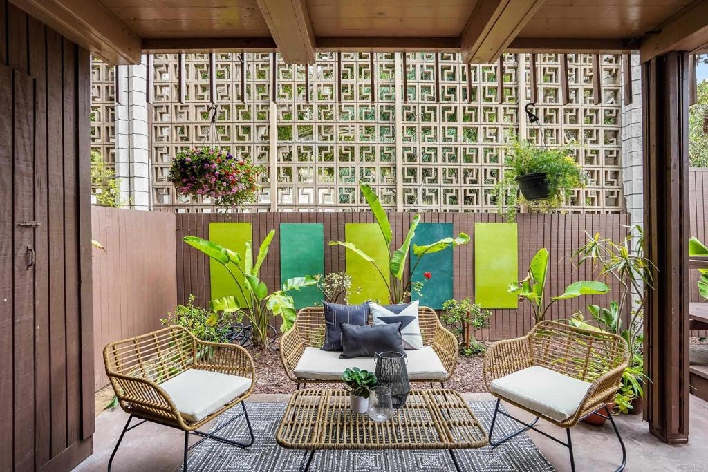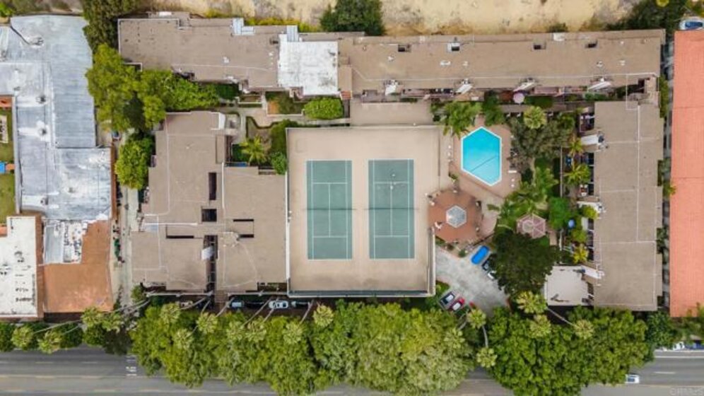 ICONIC MID CENTURY ARCHITECTURE…. The swinging HOT SPOT in the late 60's/70's, still TIMELESS today! Literally 1 mile to beach! FIRST TIME ON MARKET…OPEN BRIGHT SMASHING REMODEL! PRIVATE ground floor SINGLE LEVEL END UNIT! …One of a Kind location with PRIVATE wrap around YARD Featuring a covered patio, a sunny deck and sideyard ideal for a dog run. … French Oak Flooring throughout, Custom Paint & Trim……All NEW SUNNY AND WHITE Kitchen…… Sparkling QUARTZ counters, SHAKER cabinets, ALL NEW STAINLESS APPLIANCES, canned dimmer lighting …..Built in BREAKFAST/COFFEE BAR plus built in WINE BAR or ENTERTAINMENT BUFFET at spacious DINING AREA……HUGE LIVING AREA with oversized sliders to outside... BEDROOM 1 opens w/Double Doors allowing long look lines to Living Area, Glass Door to patio, and oversized window…. Smaller.....10' x 7' .....BEDROOM 2 is set up as OFFICE (no closet but room for) w/double door views to two garden areas ….TRANQUIL BATH: NEW Tavertine look porcelain tiled walk-in shower w/ marble stone floor, Vanity and wall heater. Bathroom can be separately accessed from Bedroom 1 OR Living Area..… INSIDE Stackable Washer dryer hookup, NEW efficient electric baseboard heaters, Gated covered Parking Space. LJRC Pool, Spa, Tennis Courts, Wellness/workout Center, ClubHouse. This is a V E R Y UNIQUE unit at La Jolla Racquet Club. Ready for summer fun now!