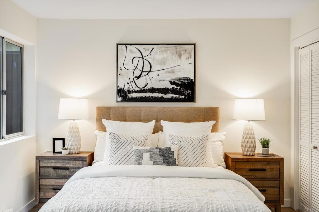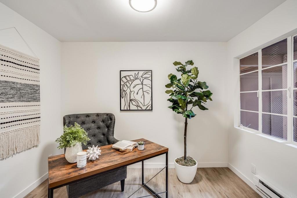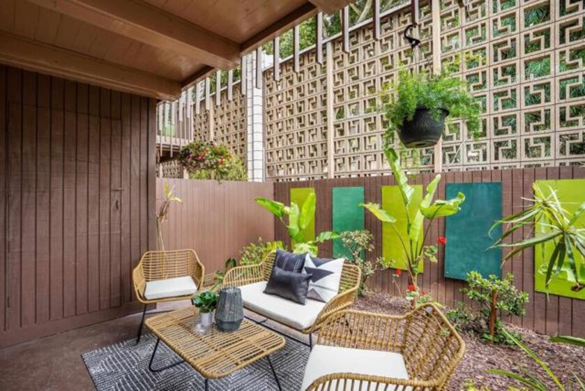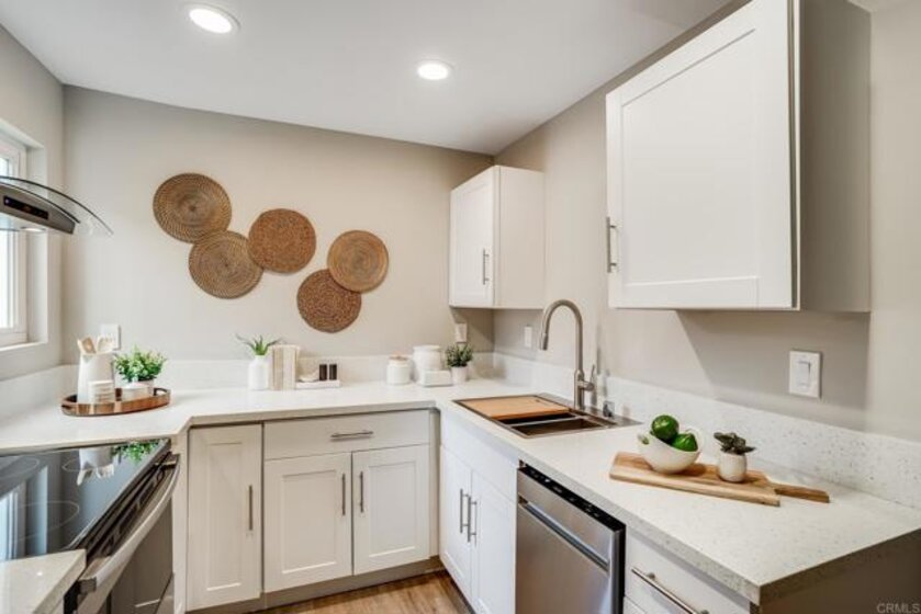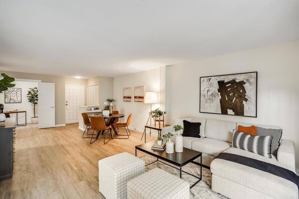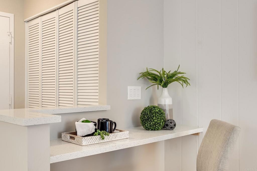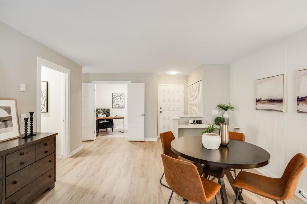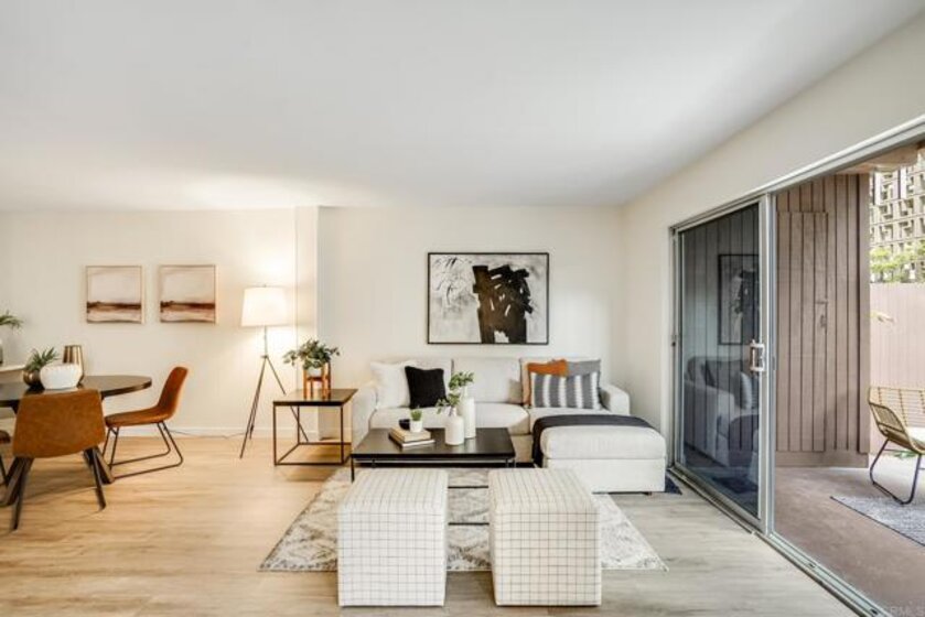 ICONIC MID CENTURY ARCHITECTURE…. The swinging HOT SPOT in the late 60's/70's, still TIMELESS today! Literally 1 mile to beach! FIRST TIME ON MARKET…OPEN BRIGHT SMASHING REMODEL! PRIVATE ground floor SINGLE LEVEL END UNIT! …One of a Kind location with PRIVATE wrap around YARD Featuring a covered patio, a sunny deck and sideyard ideal for a dog run. … French Oak Flooring throughout, Custom Paint & Trim……All NEW SUNNY AND WHITE Kitchen…… Sparkling QUARTZ counters, SHAKER cabinets, ALL NEW STAINLESS APPLIANCES, canned dimmer lighting …..Built in BREAKFAST/COFFEE BAR plus built in WINE BAR or ENTERTAINMENT BUFFET at spacious DINING AREA……HUGE LIVING AREA with oversized sliders to outside... BEDROOM 1 opens w/Double Doors allowing long look lines to Living Area, Glass Door to patio, and oversized window…. Smaller.....10' x 7' .....BEDROOM 2 is set up as OFFICE (no closet but room for) w/double door views to two garden areas ….TRANQUIL BATH: NEW Tavertine look porcelain tiled walk-in shower w/ marble stone floor, Vanity and wall heater. Bathroom can be separately accessed from Bedroom 1 OR Living Area..… INSIDE Stackable Washer dryer hookup, NEW efficient electric baseboard heaters, Gated covered Parking Space. LJRC Pool, Spa, Tennis Courts, Wellness/workout Center, ClubHouse. This is a V E R Y UNIQUE unit at La Jolla Racquet Club. Ready for summer fun now!