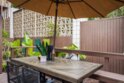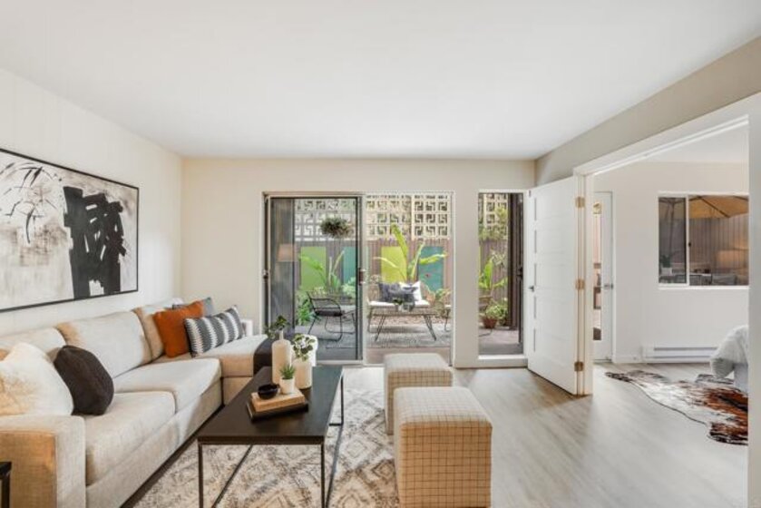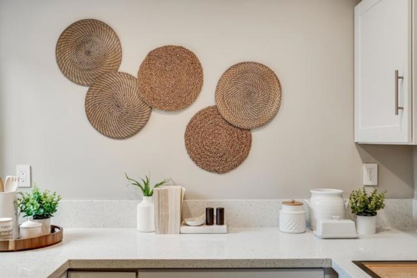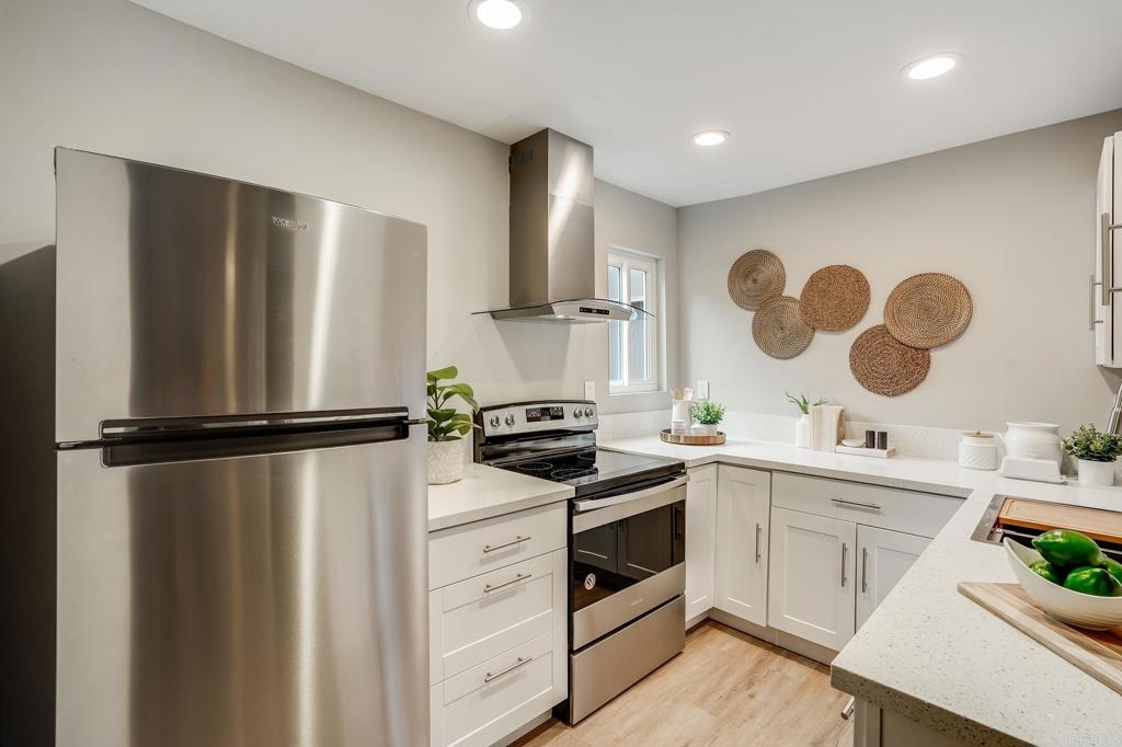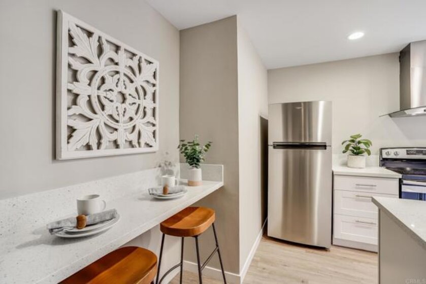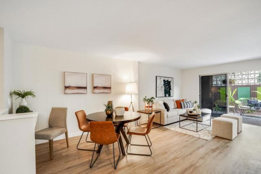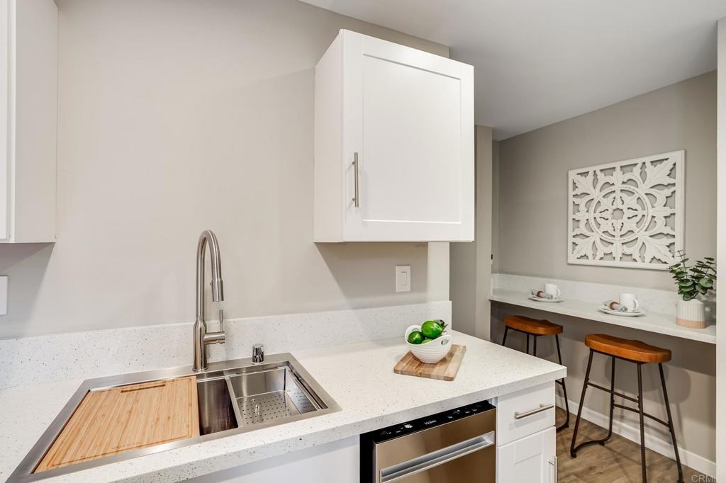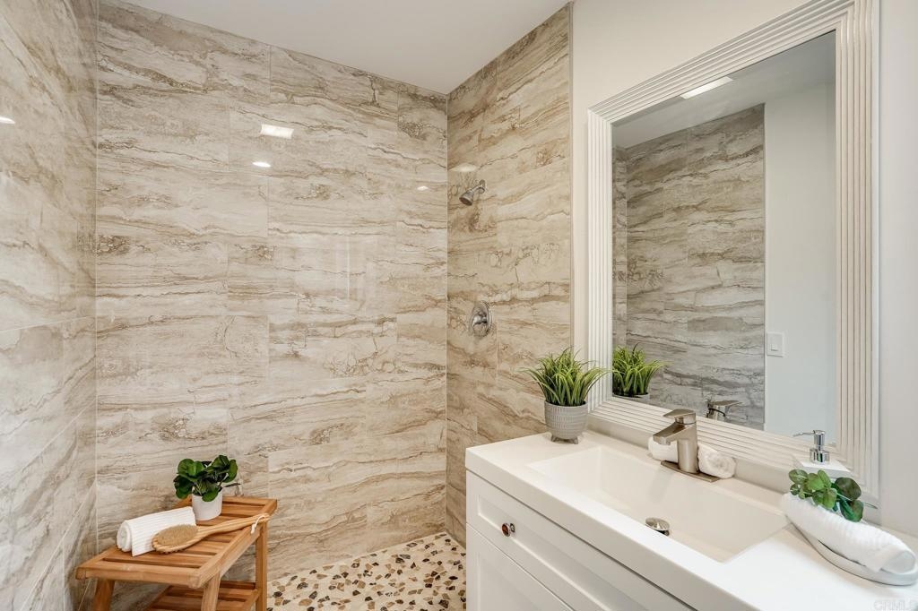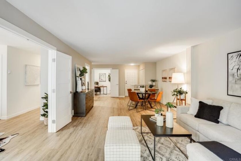 ICONIC MID CENTURY ARCHITECTURE…. The swinging HOT SPOT in the late 60's/70's, still TIMELESS today! Literally 1 mile to beach! FIRST TIME ON MARKET…OPEN BRIGHT SMASHING REMODEL! PRIVATE ground floor SINGLE LEVEL END UNIT! …One of a Kind location with PRIVATE wrap around YARD Featuring a covered patio, a sunny deck and sideyard ideal for a dog run. … French Oak Flooring throughout, Custom Paint & Trim……All NEW SUNNY AND WHITE Kitchen…… Sparkling QUARTZ counters, SHAKER cabinets, ALL NEW STAINLESS APPLIANCES, canned dimmer lighting …..Built in BREAKFAST/COFFEE BAR plus built in WINE BAR or ENTERTAINMENT BUFFET at spacious DINING AREA……HUGE LIVING AREA with oversized sliders to outside... BEDROOM 1 opens w/Double Doors allowing long look lines to Living Area, Glass Door to patio, and oversized window…. Smaller.....10' x 7' .....BEDROOM 2 is set up as OFFICE (no closet but room for) w/double door views to two garden areas ….TRANQUIL BATH: NEW Tavertine look porcelain tiled walk-in shower w/ marble stone floor, Vanity and wall heater. Bathroom can be separately accessed from Bedroom 1 OR Living Area..… INSIDE Stackable Washer dryer hookup, NEW efficient electric baseboard heaters, Gated covered Parking Space. LJRC Pool, Spa, Tennis Courts, Wellness/workout Center, ClubHouse. This is a V E R Y UNIQUE unit at La Jolla Racquet Club. Ready for summer fun now!