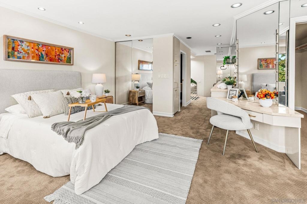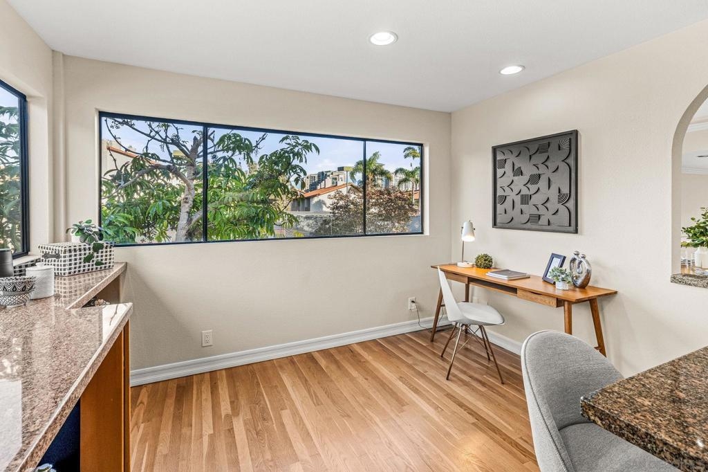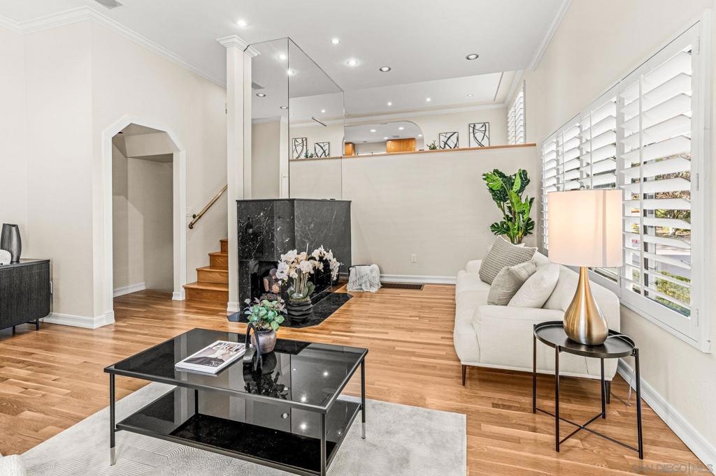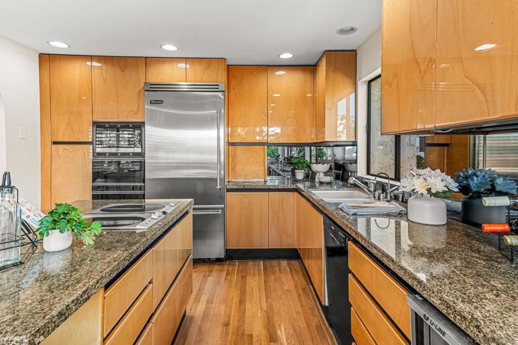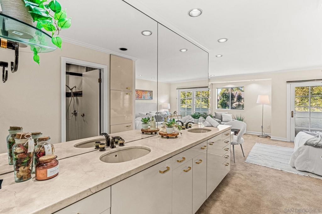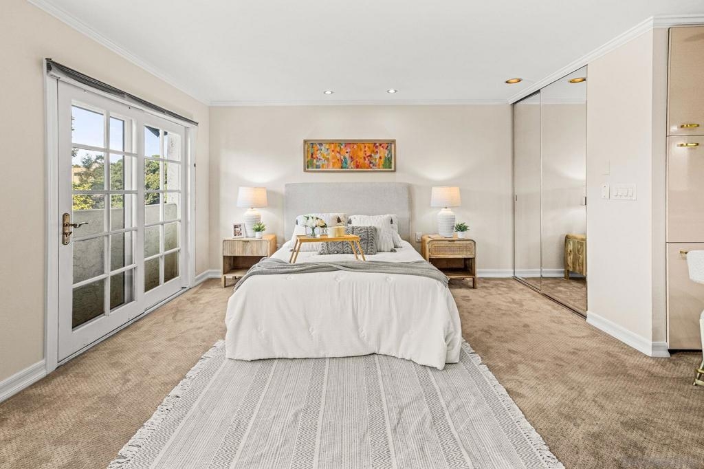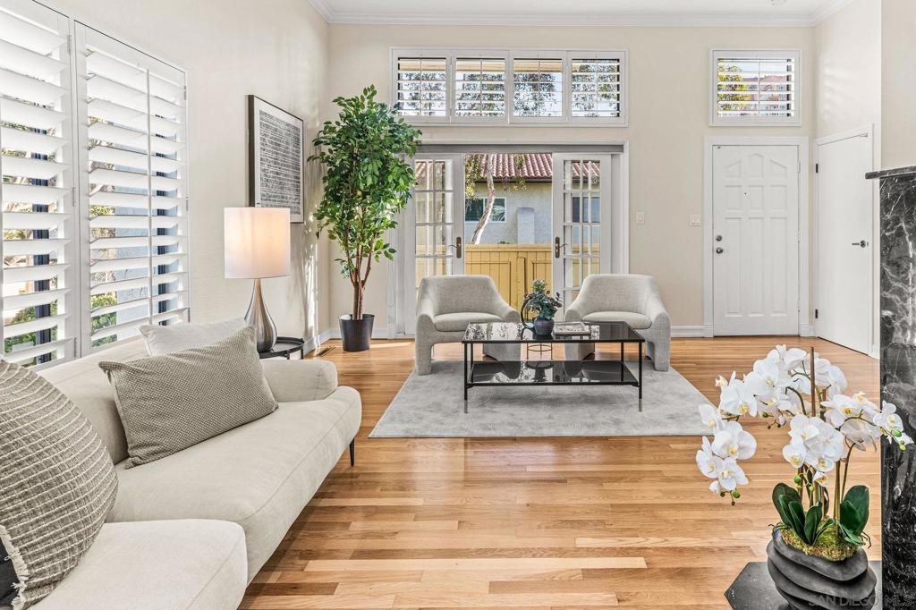 This 1720SF pristine END UNIT townhouse with extensive views and upgrades is in an estate situation and priced to sell! As an additional bonus, the original owners elevated every space with premium finishes and clever touches that make daily living both comfortable and inspiring, providing you with a sparkling move-in condition that can be shown on short notice! The main level entry welcomes you with newly refinished white oak hardwood floors and custom small-pane sliding glass doors that flood the space with natural light. The fireplace, once ordinary brick, now commands attention with sleek black marble and a remote-control start. The living room flows seamlessly to a private patio, perfect for BBQs and entertaining, while an arched doorway leads to the two-car garage complete with washer and dryer. A mirrored powder room — inspired by a famous New York restaurant — makes a great conversation piece. Rare for this complex, the home features a full circulating heat and air conditioning system, recently upgraded with a brand-new HVAC. The dining area includes a built-in bar with granite countertop and sink, ideal for hosting friends and family. The oversized kitchen is a showstopper, surrounded by picture windows with views of mature landscaping, the tennis courts, and pool. Morning sun pours in, creating a warm, energizing start to your day. There’s ample space for a casual seating area, home office, or reading nook, with built-in cabinetry for books, a TV, and even a wine refrigerator. Top-of-the-line appliances include an oversized Viking refrigerator, Bosch dishwasher, and Gaggenau ovens and cooktop. Italian handcrafted cabinets, granite counters, and a large center island that doubles as a table make this space a chef’s dream. A custom skylight brightens the upper level. One bedroom serves beautifully as a guest suite or office, with built-in cabinets, marble countertop, and hidden refrigerator. The luxurious bathroom features a marble-clad two-person Jacuzzi tub, a dual-sink marble vanity, and a spacious skylit shower. The primary suite is a private haven with abundant closets, built-in cabinetry, a wall safe, hidden storage, a dressing table with Hollywood lighting, and a show-stopping walk-in closet designed to display and organize any wardrobe. With over 1,700 sq. ft. of living space, a premium remodel valued at over $200 per sq. ft., and an offering price below $700 per sq. ft., this home represents exceptional value in the area. Rare central heat and A/C, unmatched attention to detail, and exquisite design throughout make this more than a home — it’s a statement of comfort, style, and the good life.