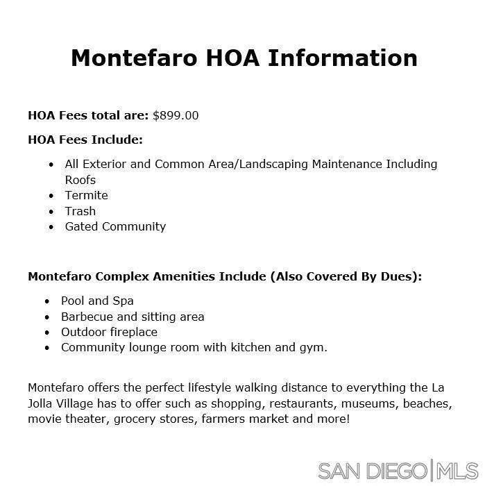 A true sense of luxury can be felt inside and out this light, bright and airy top floor single level end-unit. This elegantly appointed home creates the perfect comfort and sophistication to enjoy beautiful sunsets and some ocean views. Explore your culinary endeavors in the gourmet kitchen with center island, granite counters, pantry, stainless steel appliances and abundance of cabinetry. The master suite has generous sized master bath, soaking tub, his and her vanities, and walk-in closet. Two convenient and close by assigned underground parking spaces #31 and #32. You also have your own storage area and ample guest parking in garage . Montefaro offers the perfect lifestyle walking distance to everything the La Jolla Village has to offer such as shopping, restaurants, museums, beaches, movie theater, grocery stores, farmers market and more! There are also exceptional amenities including a pool, spa, barbecue area, fireplace, community lounge room with kitchen and gym. Complex Features: ,,,,,, Equipment: Dryer, Washer Sewer: Sewer Connected, Public Sewer Topography: LL
