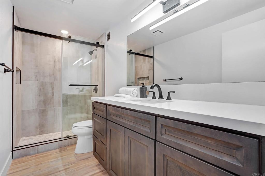 Live walking distance from La Jolla Shores Beach and just 2 minutes from I-5! Incredible opportunity to own this sunny, quiet, west facing, fully upgraded, move-in ready unit boasting the largest floorplan in Shore Tower. This spacious 2 bedroom, 2 full bathroom unit includes separate office space (optional 3rd bedroom) and a wonderful open floorplan. The unit includes a large balcony that overlooks the sparkling pool and spa--which sits before a beautiful mountainous and coastal backdrop. Brand-new kitchen including new custom cabinetry, quartz countertops with a bar-style counter and waterfall finish. New Samsung-brand appliances. New exotic distressed hardwood floors & carpet, scraped ceilings, fresh paint throughout, big closets--including a walk-in master closet, and an extra storage room. New custom-tiled showers, new cabinets, and new vanities. Resort-style amenities included: heated pool, spa, 2 lighted tennis courts, sauna, gym with showers and restrooms, recreation room/ clubhouse, and security patrolling the building. HOA also includes common area maintenance, trash pickup, and hot water. The complex even has 2 guest suites that can be used by guests of the residents that live here. A wonderful primary or secondary home close to La Jolla Shores Beach, UCSD, and Scripps Hospitals. On-site property manager, security building with plenty of guest parking. This unit includes 2 assigned garage parking spaces, as well as plenty of guest parking on site. Plenty of off-street parking also available.