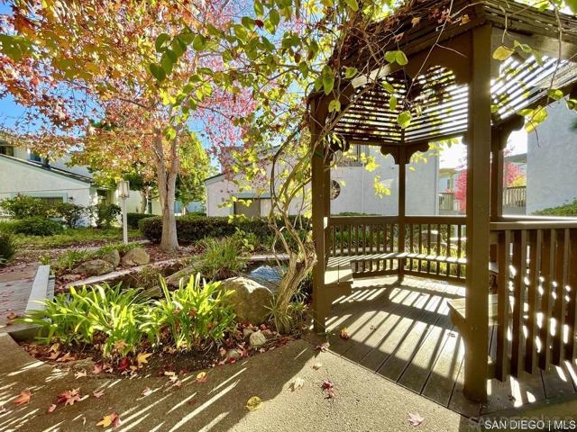 This recently updated end-unit townhome in The Woodlands La Jolla has been upgraded with dual pane windows and blinds, remodeled kitchen and bathrooms with fresh paint makes this home turn-key ready! After hanging your belongings in the entry closet, step into a cozy living room featuring functional pellet stove fireplace and a remote controlled Lutron motorized shade. Open the newer dual-pane sliding door to a generous patio area. Back inside, ascend a few stairs in this split-level home to a dining area that is open to the kitchen separated by a countertop bar. Inside the recently updated kitchen you'll find new custom cabinets and quartz countertops, with upgrades such as under-cabinet LED lighting, a corner cabinet carousel feature, and sliding pantry shelving. An additional and extended Juliet balcony off of the kitchen. Lastly a guest bedroom with double doors and full guest bathroom with closet built-ins complete the level. Ascend the full floor staircase to a loft area off the primary bedroom. A sliding dual-pane door opens to an outdoor patio area. Enter into the primary bedroom with 2 sliding mirror door closets and updated ensuite bathroom/shower with bamboo cabinetry and brushed hardware matching the kitchen and guest bath. The bottom level 2-car garage finished garage features laundry area, countertop with built-in over and under-cabinetry, with more built-in cabinetry flanking the wall as well. Community amenities include lush landscaped walking paths, serene park-like gazebo sitting areas, and community/club room with adjoining pool and spa. Villa La Jolla Pa