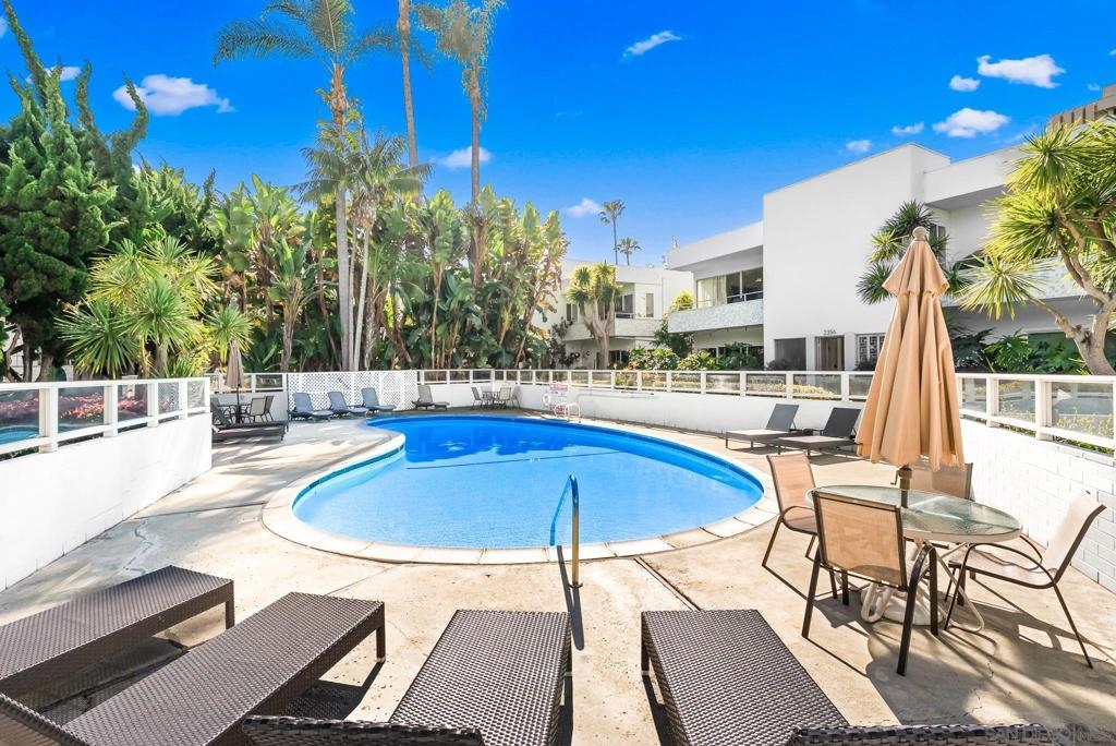 This beautiful top-floor, single-story 3-bedroom, 2-bath La Jolla condo is three blocks away from the ocean and close to La Jolla Shores dining and entertainment. It has thoughtful upgrades and an open floor plan filled with natural light. Quiet and private, the residence provides a peaceful coastal retreat while remaining conveniently located. The kitchen seamlessly flows into the dining and living areas, creating an inviting layout that is ideal for entertaining and everyday living. The spacious living, dining, and sitting areas blend effortlessly, with peek ocean views enjoyed from the kitchen and bedroom windows. Double doors in the living area lead to an open patio with views of the lush courtyard, enhancing the indoor-outdoor experience and filling the home with natural light. Additional features include a private laundry closet, upgraded bathrooms, a private patio off the primary suite with beautiful views, and a garage for convenient parking and storage. The community offers easy elevator access, with an elevator located close to the unit, along with mature landscaping, a community pool, and a relaxed coastal setting. HOA fees include: water, electricity, heat, garbage and sewer, internet, cable TV, gas for hot water heater, community pool, and community landscaping.