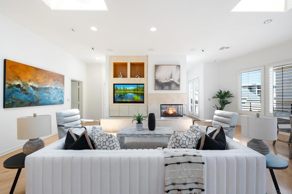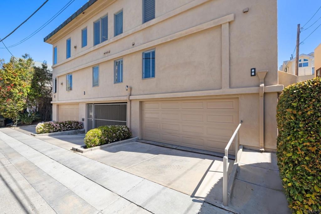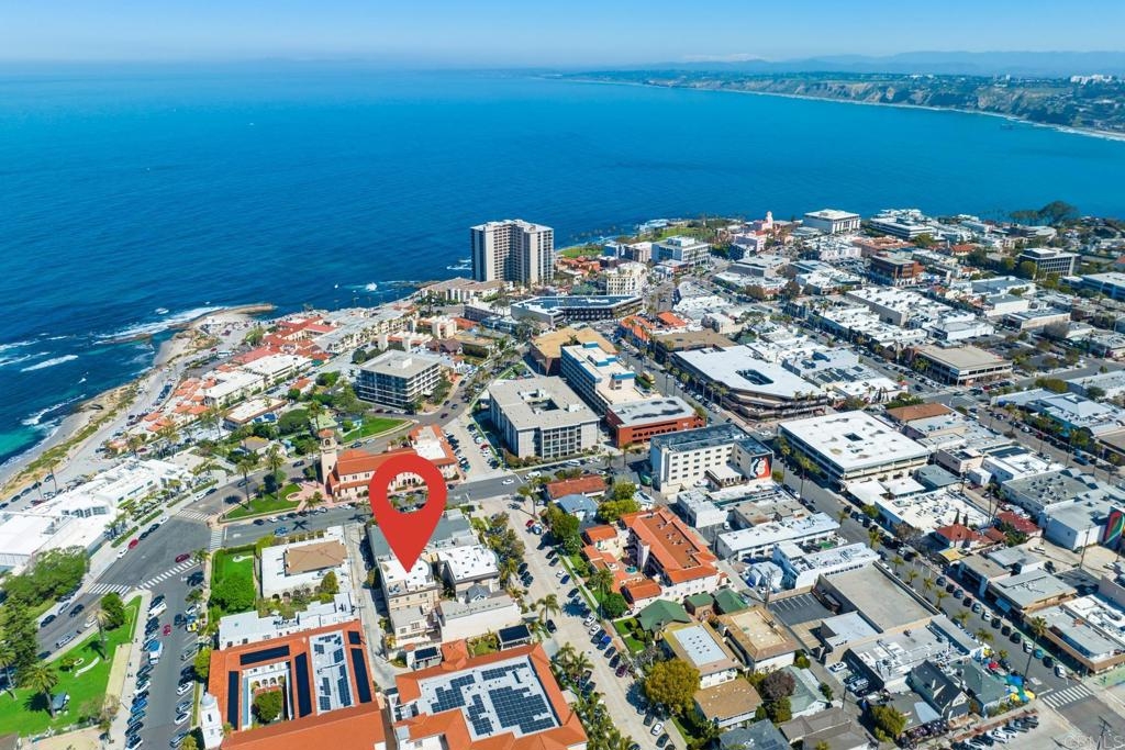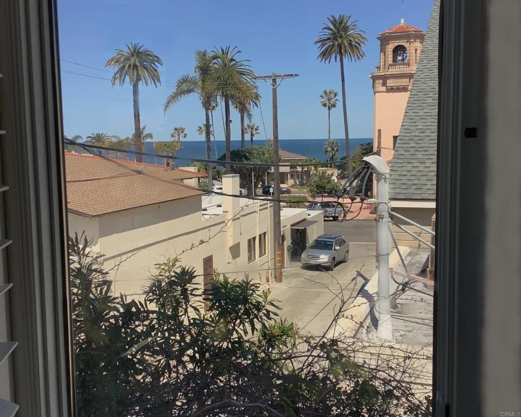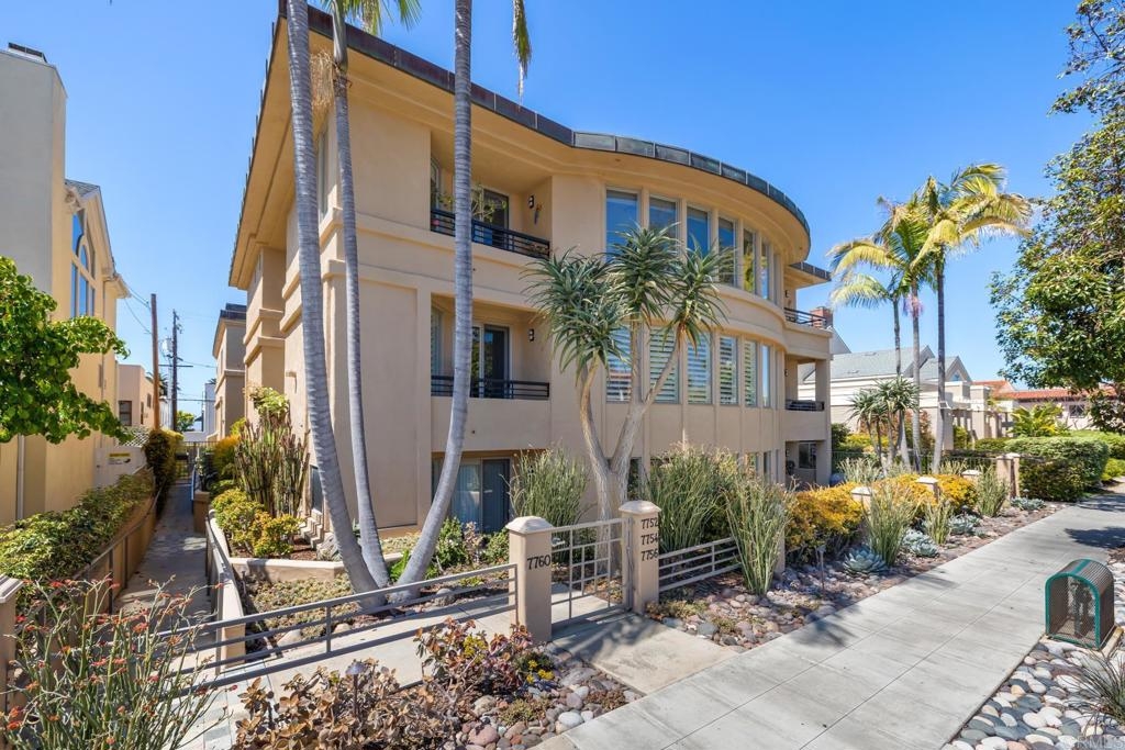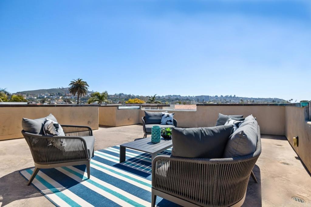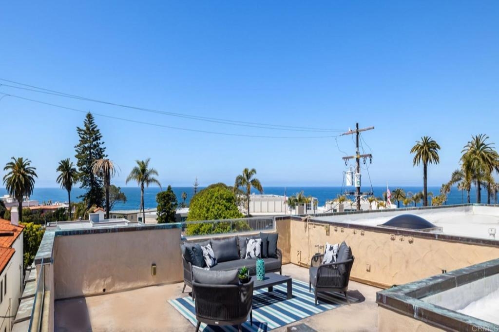 Experience the enchanting Village of La Jolla in this spacious, top-floor condo, located just a short 2.5 blocks from the ocean. With its private, gated entry and interior elevator, this oversized 3-bedroom, 2.5-bathroom condo offers the convenience of single-story living. Enjoy partial ocean views from the primary bedroom and office, while the large, private rooftop deck provides panoramic views of the ocean, village, and surrounding hills—a perfect setting for entertaining. Inside, the soaring ceilings, abundant windows, and skylights create a serene environment flooded with natural light. The primary bedroom features ocean views, walk-in closets, a cozy fireplace, double sinks, a jetted bathtub, and an oversized shower. The middle bedroom has been cleverly converted into a functional office, boasting three walls of built-in shelving. The third bedroom comes complete with an ensuite bathroom. For added convenience, there's an attached two-car garage with alley access. Within walking distance, you'll find world-class restaurants, shopping venues, parks, museums, and art galleries, ensuring endless entertainment and exploration. Additionally, pending at the seller's expense, the installation of solar panels further enhances the property's eco-friendliness.
