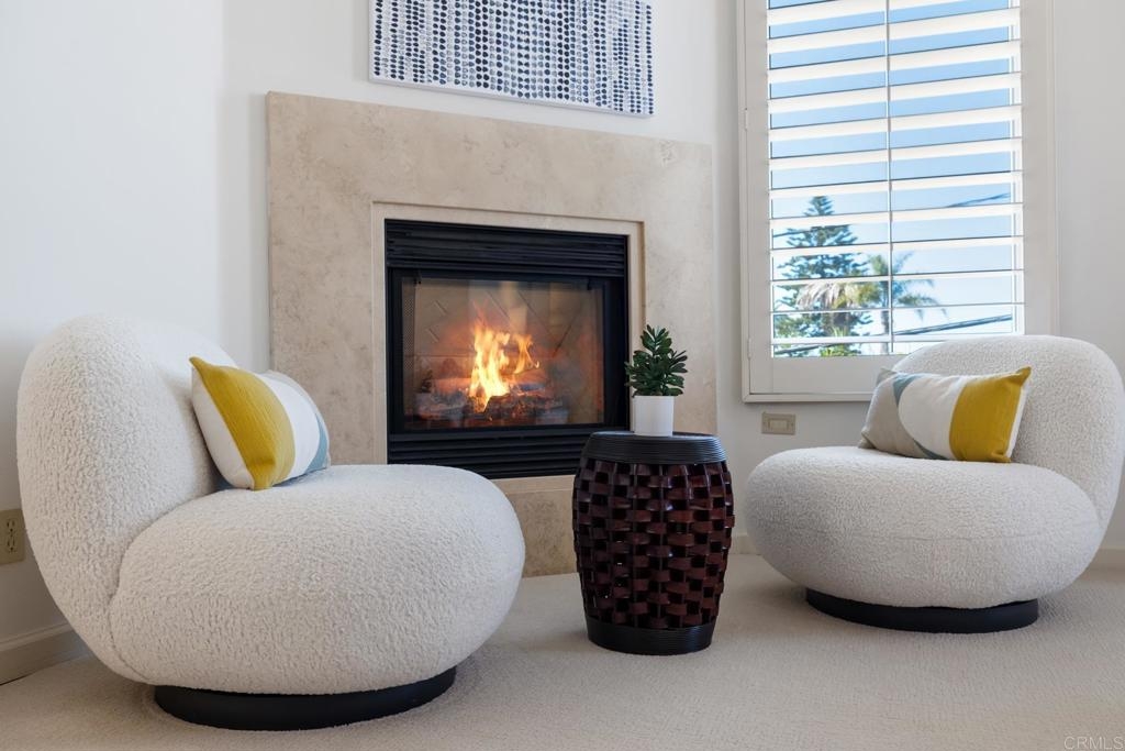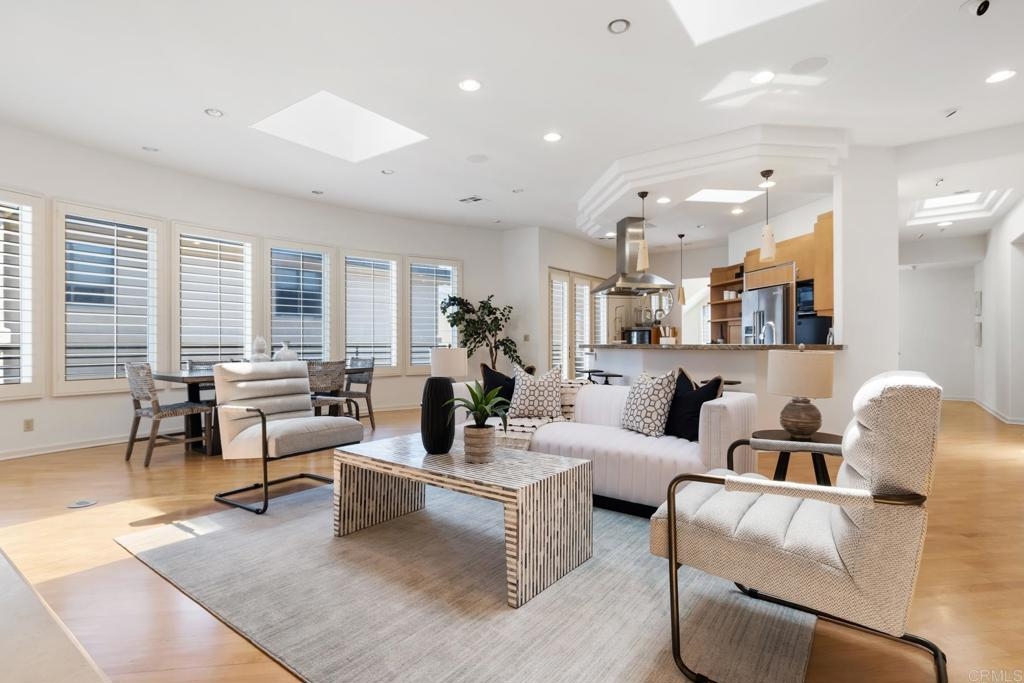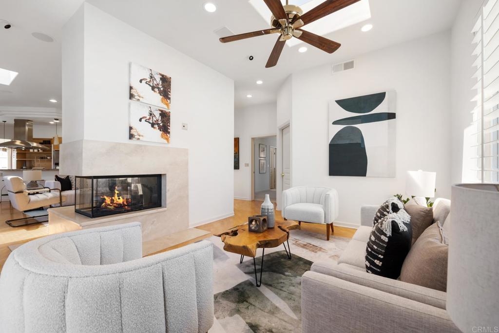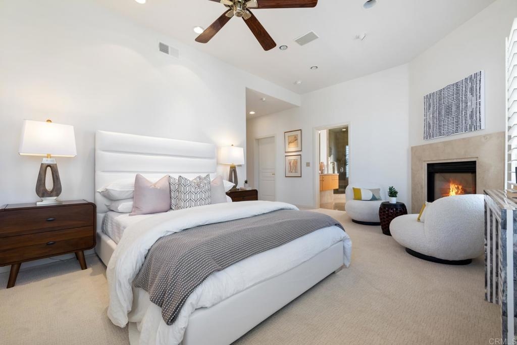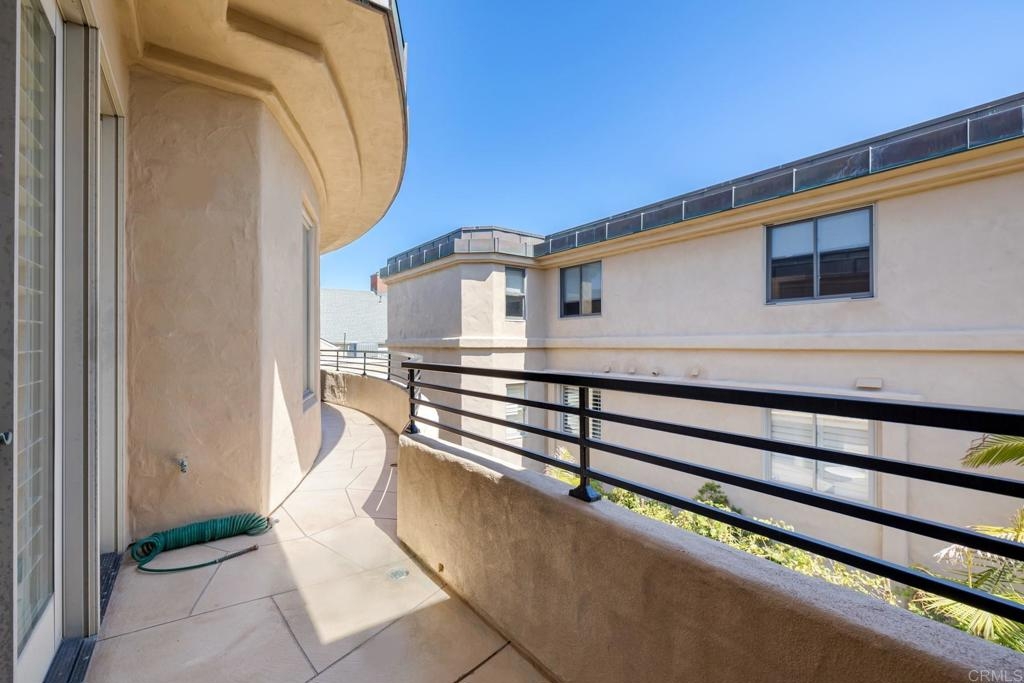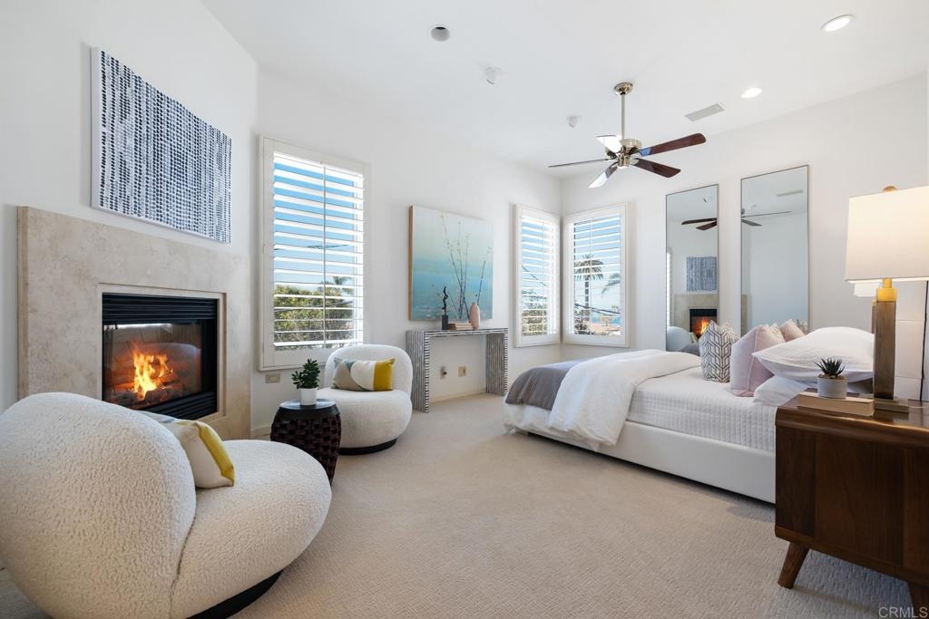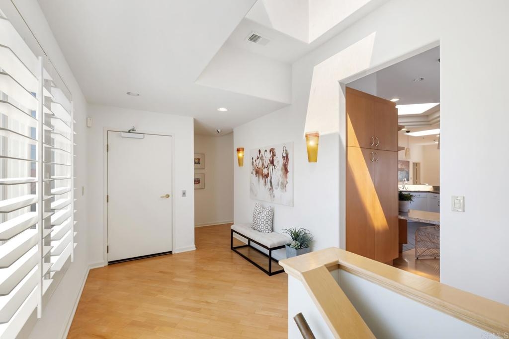 Experience the enchanting Village of La Jolla in this spacious, top-floor condo, located just a short 2.5 blocks from the ocean. With its private, gated entry and interior elevator, this oversized 3-bedroom, 2.5-bathroom condo offers the convenience of single-story living. Enjoy partial ocean views from the primary bedroom and office, while the large, private rooftop deck provides panoramic views of the ocean, village, and surrounding hills—a perfect setting for entertaining. Inside, the soaring ceilings, abundant windows, and skylights create a serene environment flooded with natural light. The primary bedroom features ocean views, walk-in closets, a cozy fireplace, double sinks, a jetted bathtub, and an oversized shower. The middle bedroom has been cleverly converted into a functional office, boasting three walls of built-in shelving. The third bedroom comes complete with an ensuite bathroom. For added convenience, there's an attached two-car garage with alley access. Within walking distance, you'll find world-class restaurants, shopping venues, parks, museums, and art galleries, ensuring endless entertainment and exploration. Additionally, pending at the seller's expense, the installation of solar panels further enhances the property's eco-friendliness.