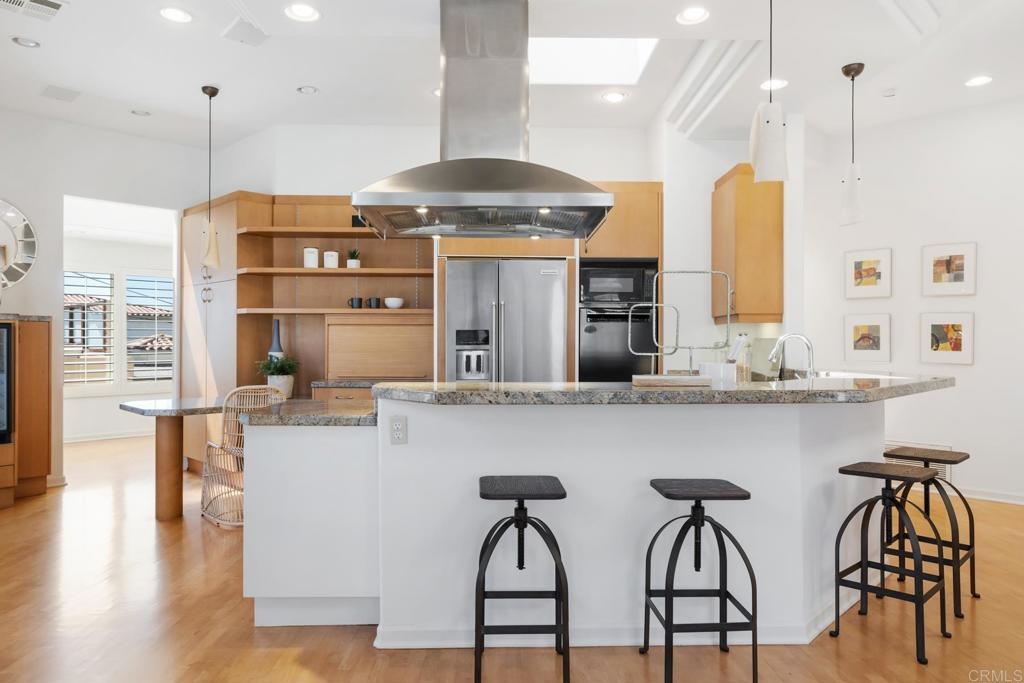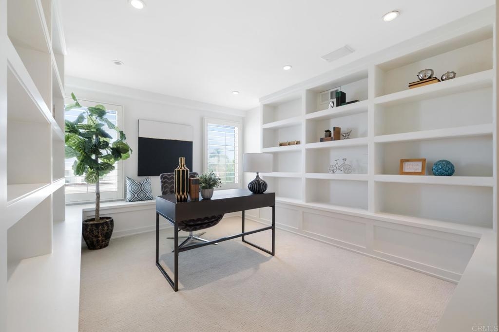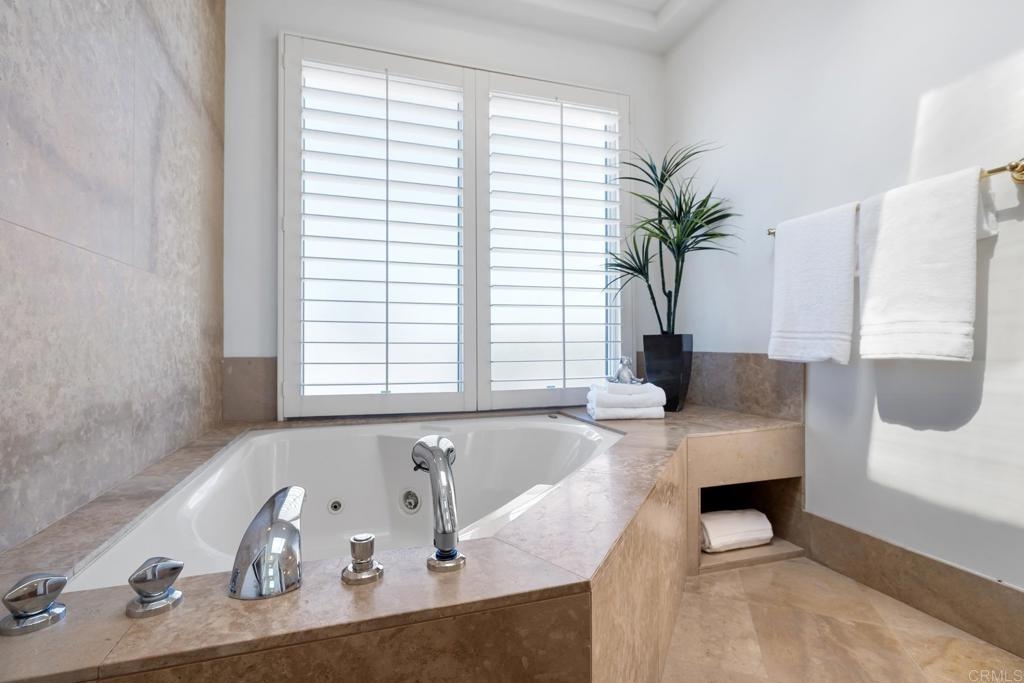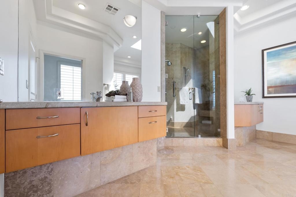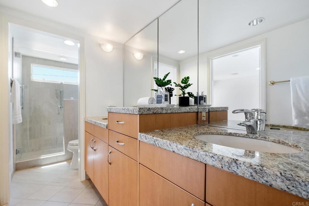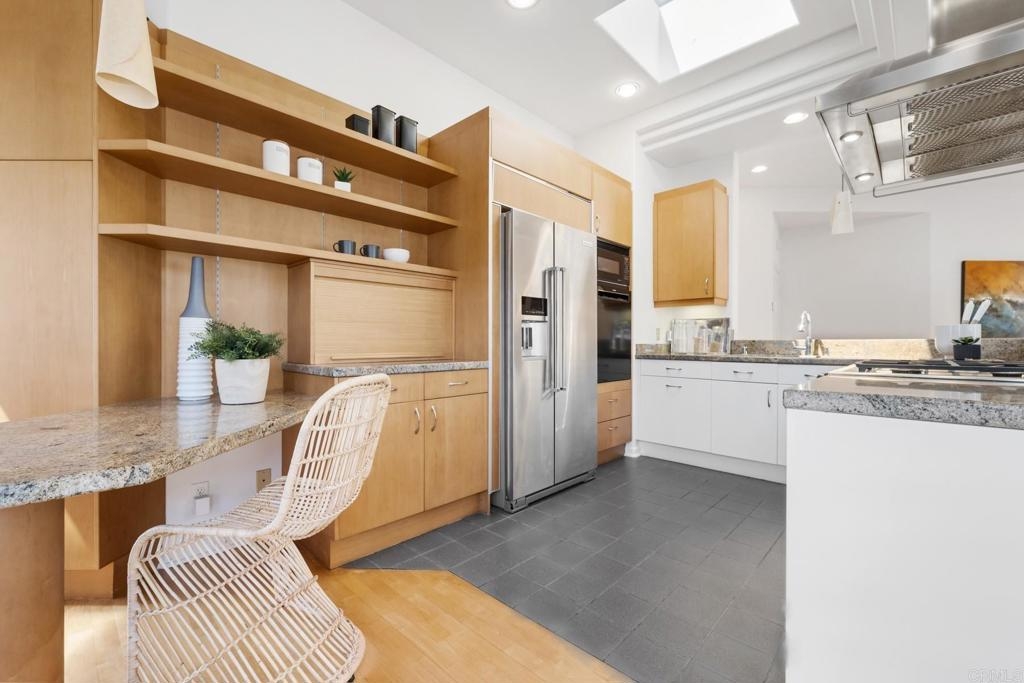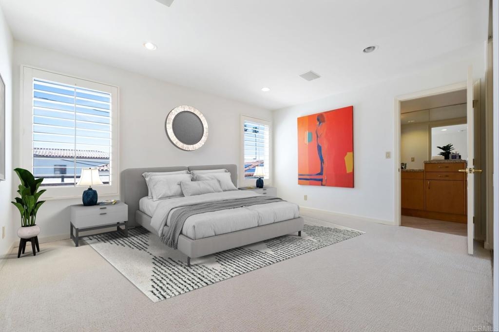 Experience the enchanting Village of La Jolla in this spacious, top-floor condo, located just a short 2.5 blocks from the ocean. With its private, gated entry and interior elevator, this oversized 3-bedroom, 2.5-bathroom condo offers the convenience of single-story living. Enjoy partial ocean views from the primary bedroom and office, while the large, private rooftop deck provides panoramic views of the ocean, village, and surrounding hills—a perfect setting for entertaining. Inside, the soaring ceilings, abundant windows, and skylights create a serene environment flooded with natural light. The primary bedroom features ocean views, walk-in closets, a cozy fireplace, double sinks, a jetted bathtub, and an oversized shower. The middle bedroom has been cleverly converted into a functional office, boasting three walls of built-in shelving. The third bedroom comes complete with an ensuite bathroom. For added convenience, there's an attached two-car garage with alley access. Within walking distance, you'll find world-class restaurants, shopping venues, parks, museums, and art galleries, ensuring endless entertainment and exploration. Additionally, pending at the seller's expense, the installation of solar panels further enhances the property's eco-friendliness.