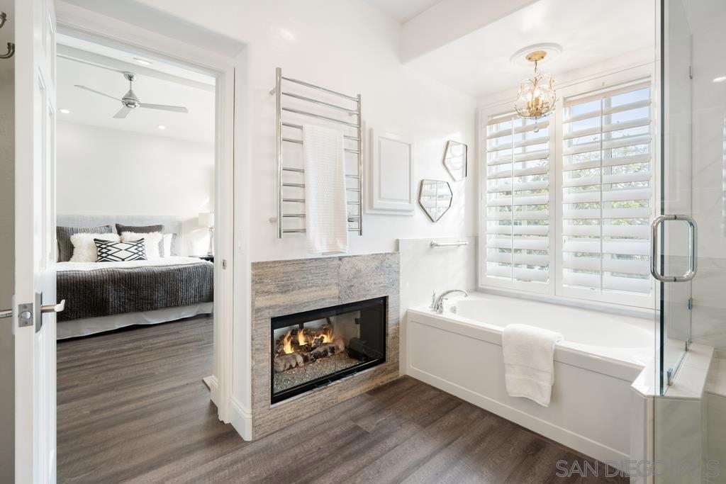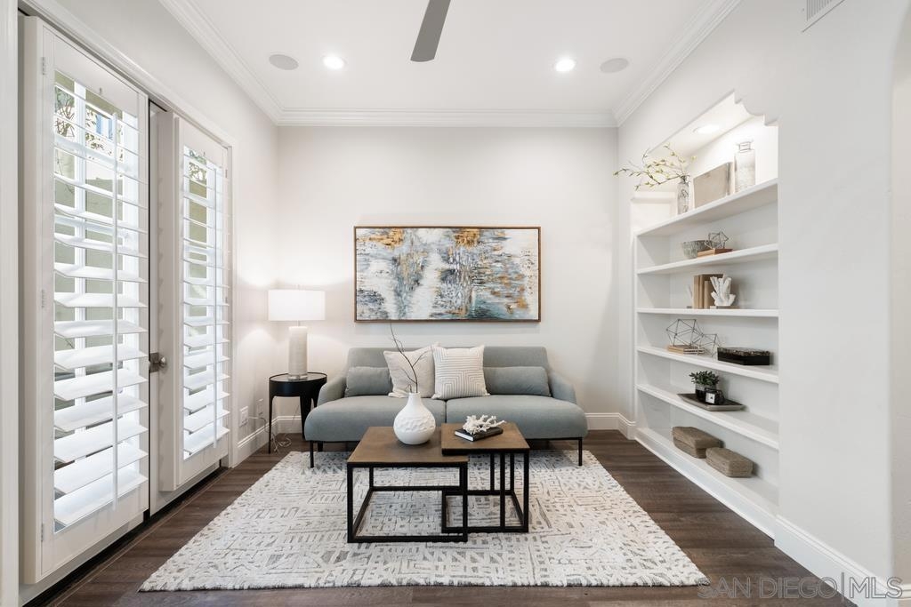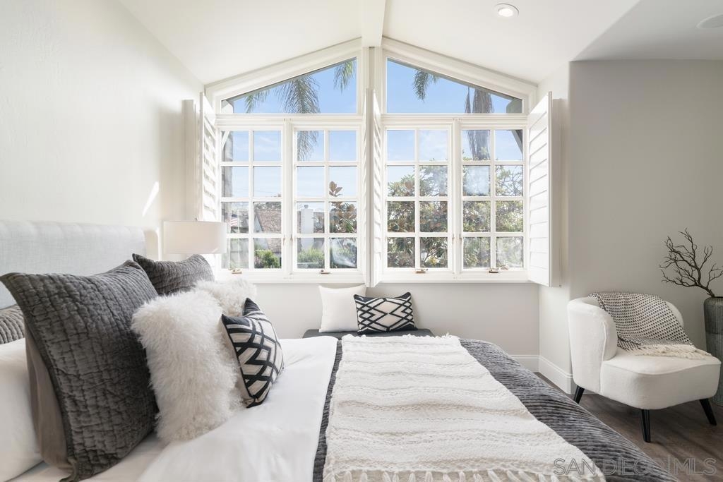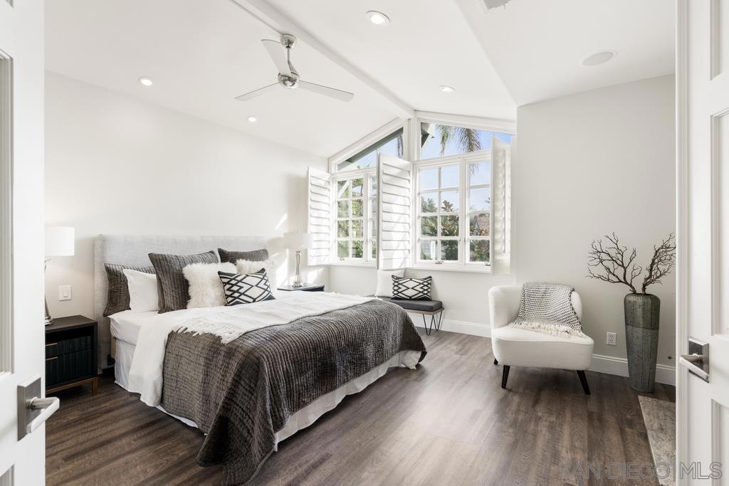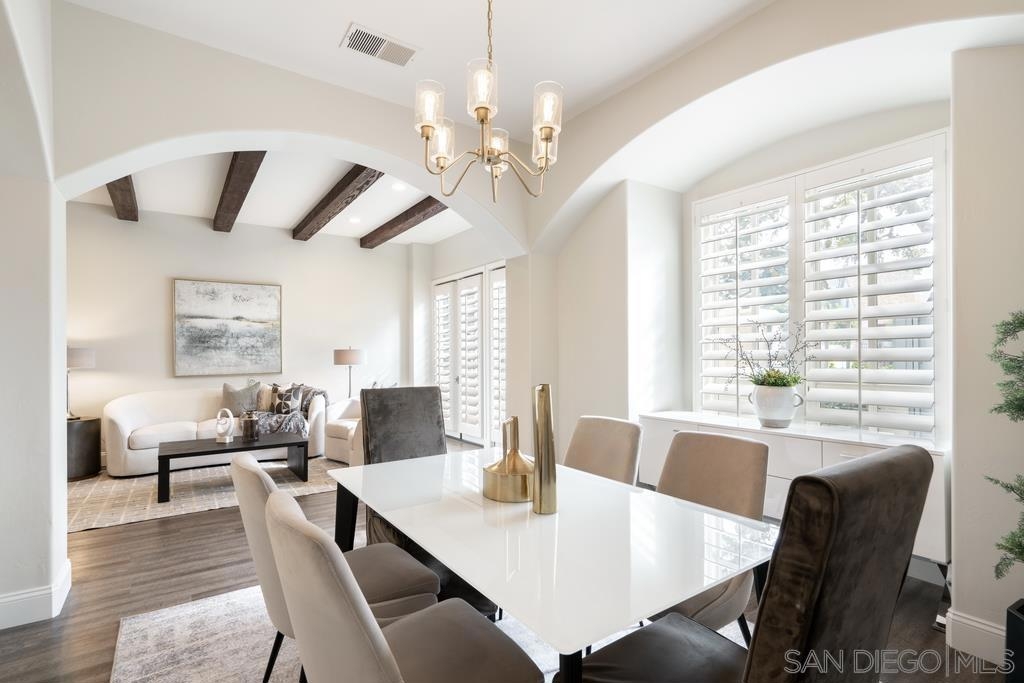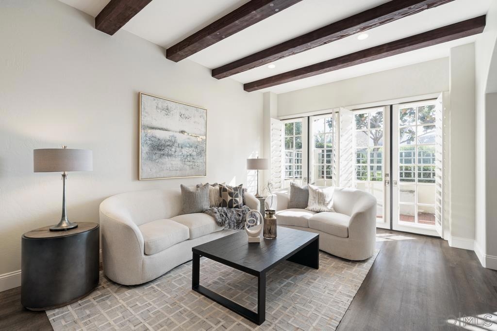 A rare gem in the heart of old La Jolla, this residence nestled in the exclusive Villas of Ivanhoe seamlessly combines contemporary flair with timeless elegance. The fusion of modern design and traditional charm is immediately evident with the formal dining room effortlessly transitioning into an expansive living room graced by a stunning mantle and fireplace. A cozy den with another fireplace on the other side of the home beckons for further moments of relaxation. This sleek and well-proportioned residence is bathed in natural light thanks to its lofty ceilings and generously sized windows and French doors. The plethora of thoughtful details and distinctive features - the natural wood beam ceilings, arched doorways and wood floors - contribute to the character and charm. The eye-catching wrap-around staircase serves as a centerpiece, adding a touch of grandeur to the overall aesthetic. The kitchen, adorned with gleaming quartz countertops, exemplifies the commitment to high-end finishes and functionality. Whether it's a quiet moment alone or a family meal, the breakfast nook adds an extra layer of coziness to the home. All three generously proportioned bedrooms and a well-placed laundry room are located on the second floor. Natural light infuses the rooms and cascades across the walls. A delightful see-through fireplace shares space with the impressive en suite primary bathroom that features a jacuzzi tub, separate shower, high vanities, double sinks, and a walk-in closet. The private patios on each side of the home invite you to embrace the indoor-outdoor lifestyle and bask in the warm Southern California sunshine and relish moments of tranquility under the open sky. This Villa ensures privacy and security as one of only thirteen residences in an exclusive gated community. With a garage entry leading to two convenient side-by-side parking spaces and storage space exclusive to the unit, arriving home is a pleasure. Villas of Ivanhoe is on the doorstep of the enchanting neighborhood of La Jolla and mere blocks away from the iconic La Jolla Cove and Children's Pool Beach and a vibrant array of restaurants, cafes and boutiques in the heart of the village. This residence offers sophistication, comfort and convenience: the perfect vantage point to immerse oneself in the rich tapestry of the La Jolla coastal lifestyle.