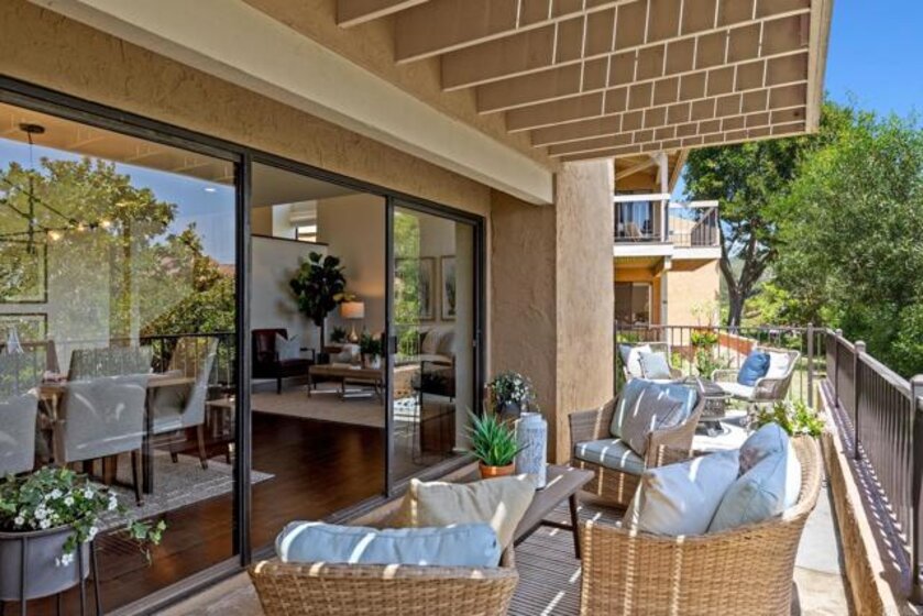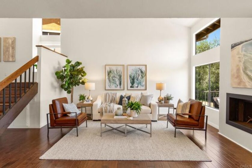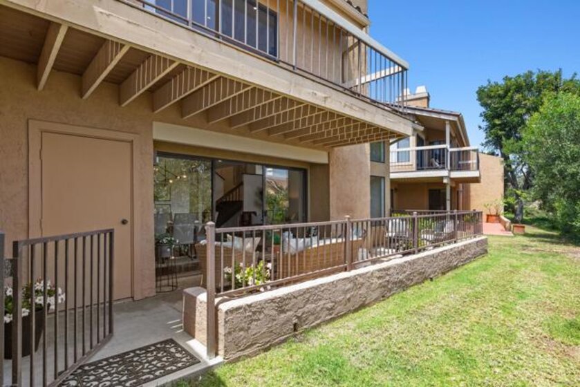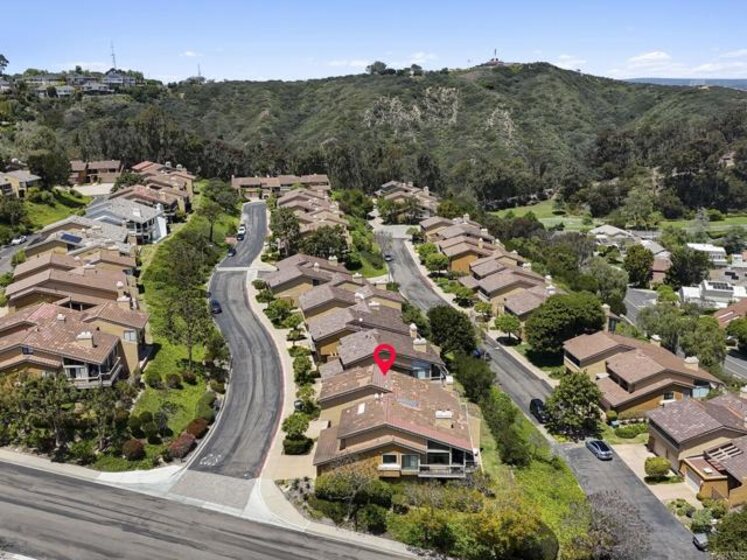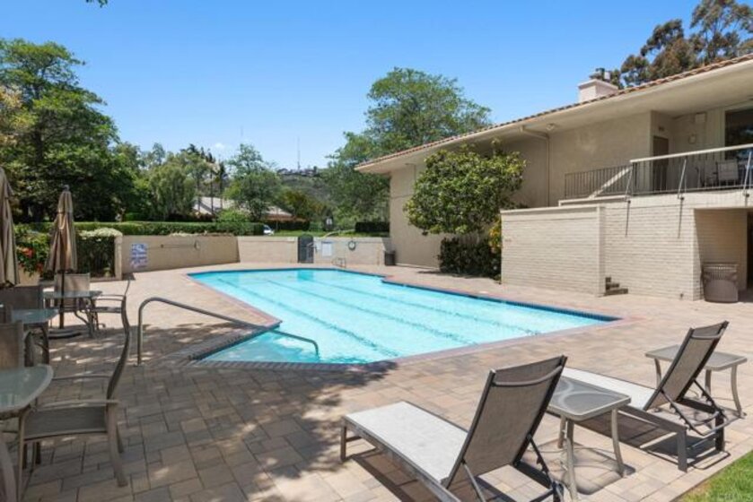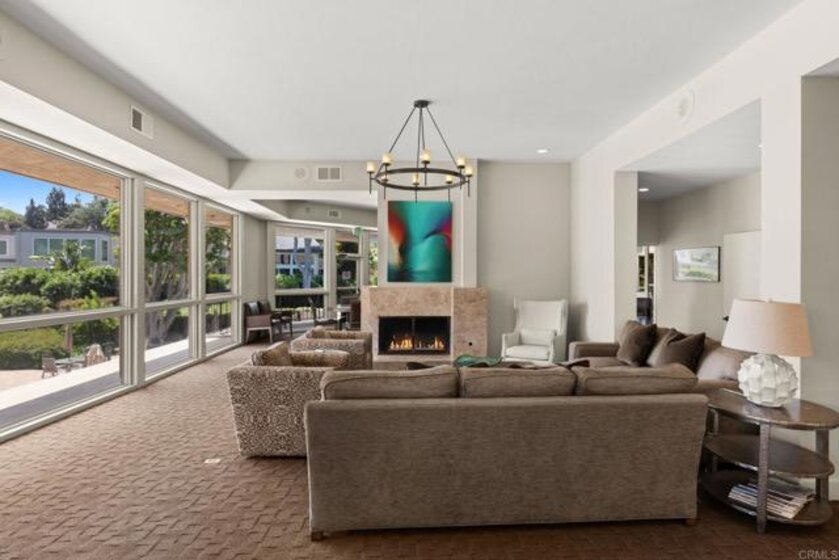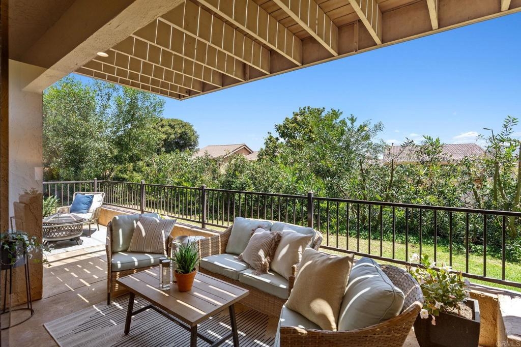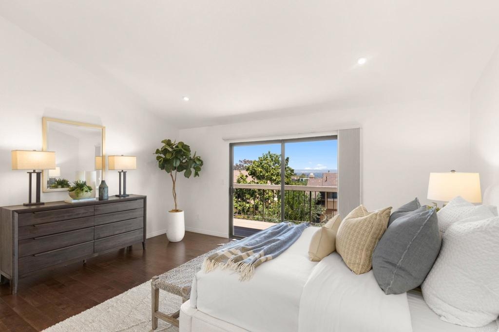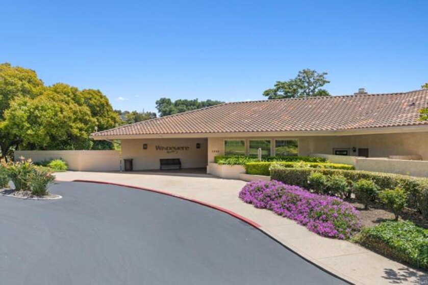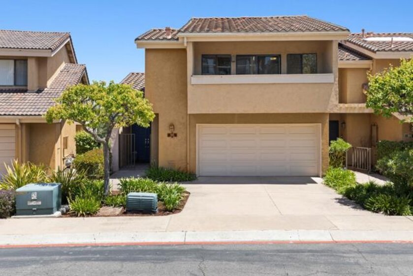 Experience the ultimate lock-and-leave lifestyle in this beautifully maintained townhome located within the guard-gated Windemere community atop Mount Soledad. This move-in ready home offers a thoughtful split-level floorplan, soaring ceilings, and an abundance of natural light throughout. The main level is designed for both comfort and entertaining, featuring a spacious living room with dramatic two-story ceilings, hardwood floors, and a Venetian plaster gas fireplace. The adjacent kitchen is equipped with natural stone countertops, premium stainless steel appliances, and bright white cabinetry. A dedicated dining area opens directly to a private patio through a sliding glass door — perfect for indoor-outdoor living. Upstairs, the primary suite is a private retreat with vaulted ceilings, a balcony offering serene mountain views, and a spa-inspired bathroom with marble flooring and countertops, dual vanities, and a generous walk-in closet. The upper level features two large bedrooms with ceilings fans as well as a full bathroom in the hallway. Additionally, the home features Central AC, an oversized storage room, and an attached two-car garage with epoxy floors, built-in cabinetry, and a side-by-side washer and dryer. Windemere offers a rare blend of resort-style amenities and natural beauty. Residents enjoy 24-hour gated security, two pools and a spa, five tennis courts, four pickleball courts, a basketball half-court, racquetball court, soccer field, dog park, playground, fitness center, saunas, walking trails, and more—all nestled within lush, parklike grounds. HOA dues include access to all recreational facilities, exterior landscaping, water (including hot water), sewer, trash, exterior maintenance (including roof and siding), termite/pest control, and basic structure insurance. Don’t miss out on this exceptional opportunity to enjoy a low-maintenance lifestyle in a vibrant and secure community!