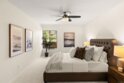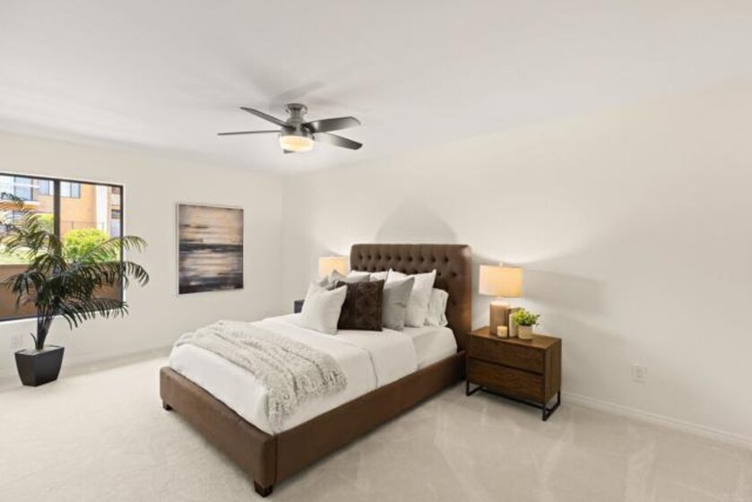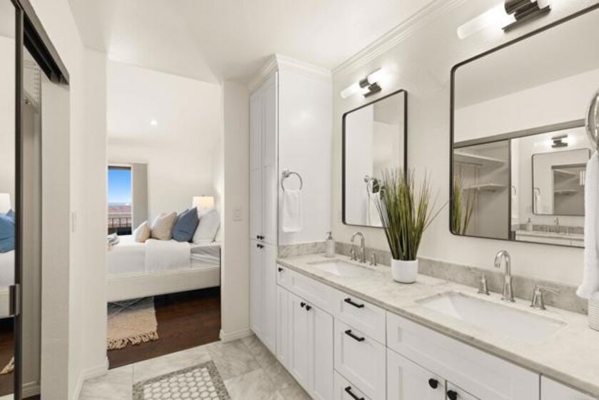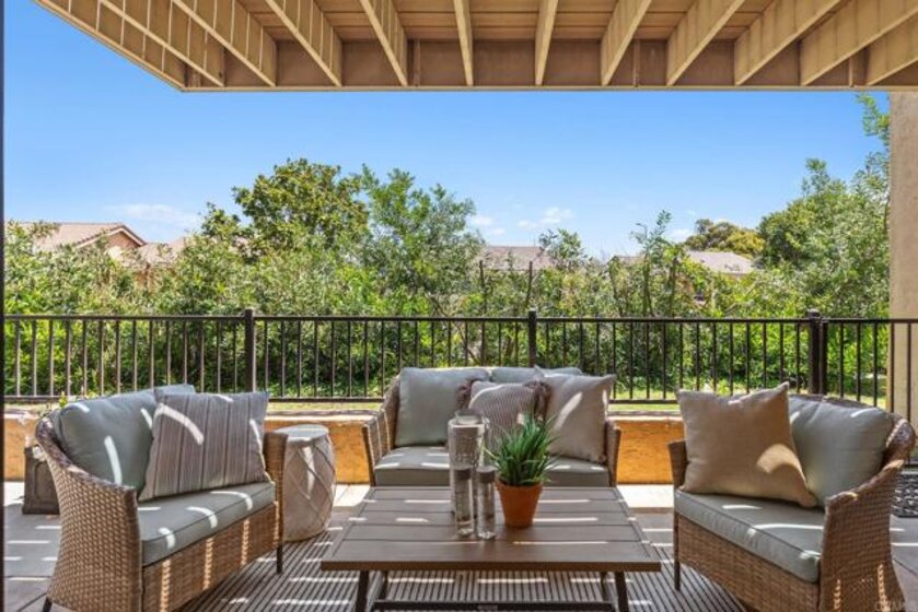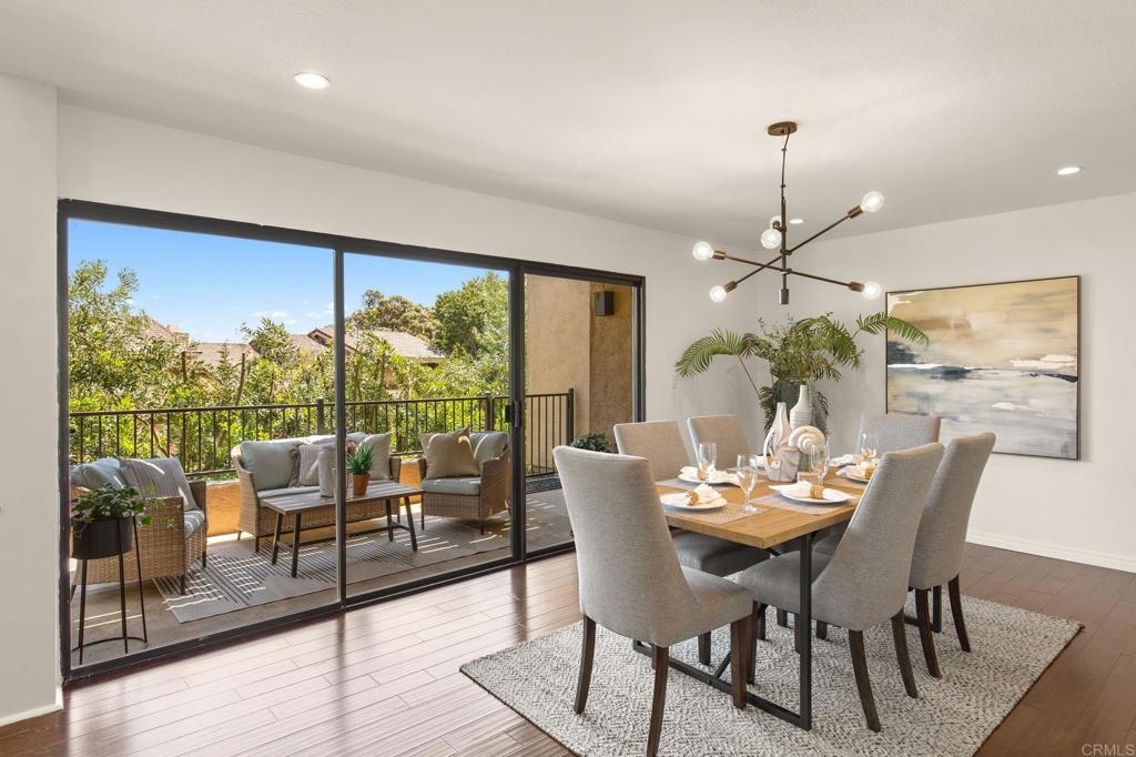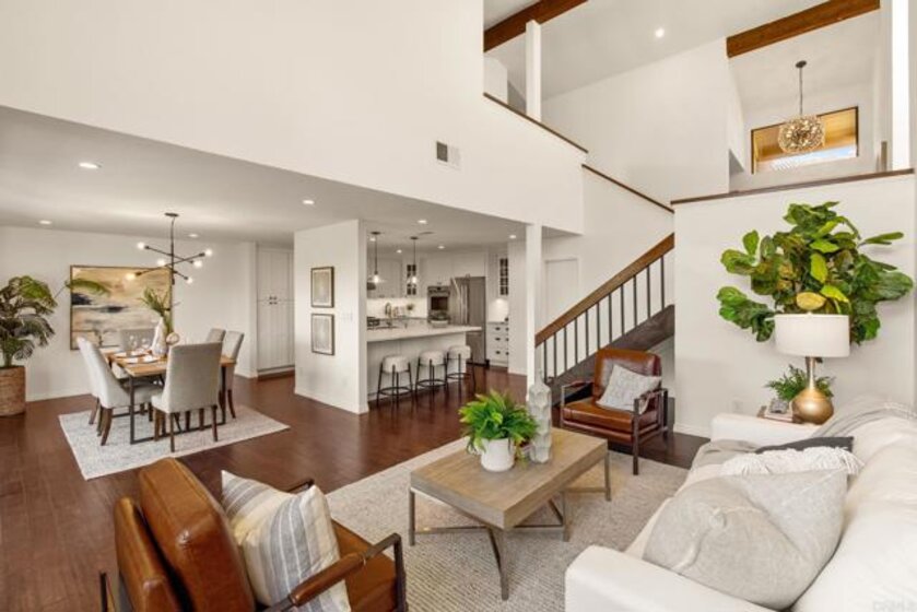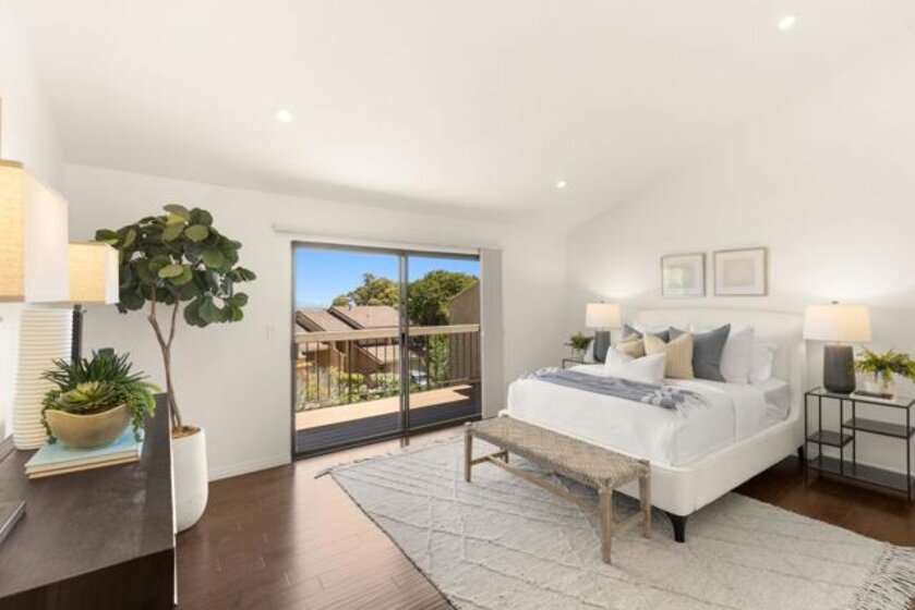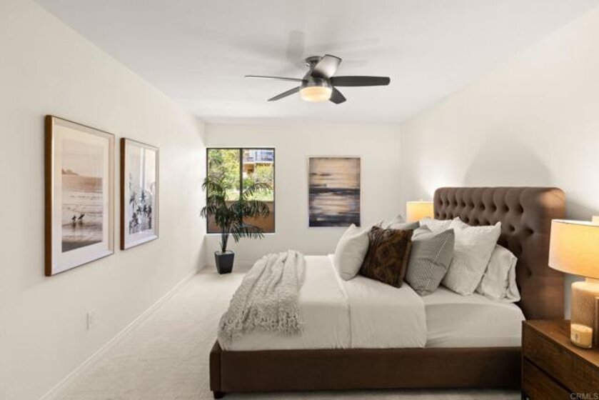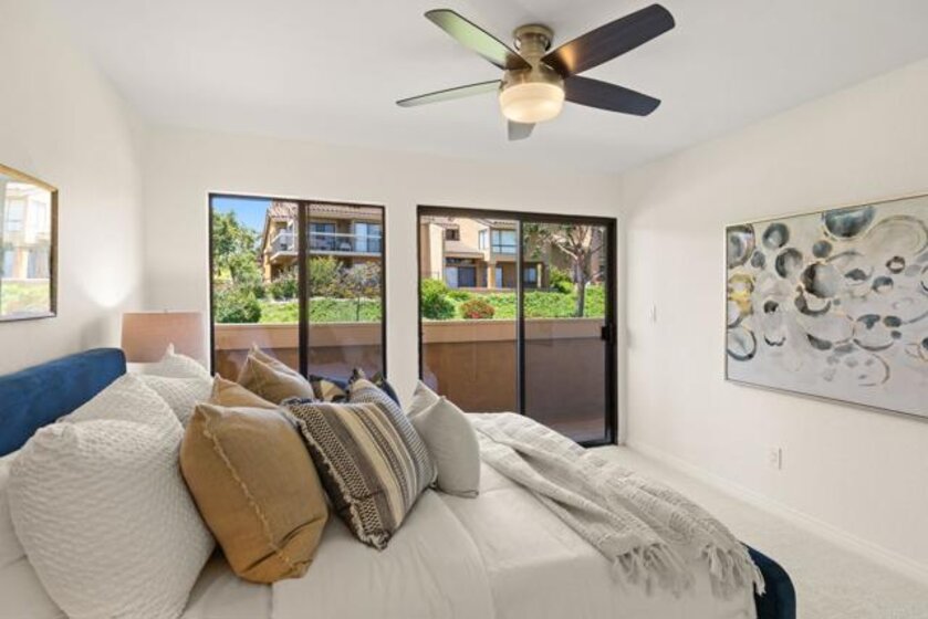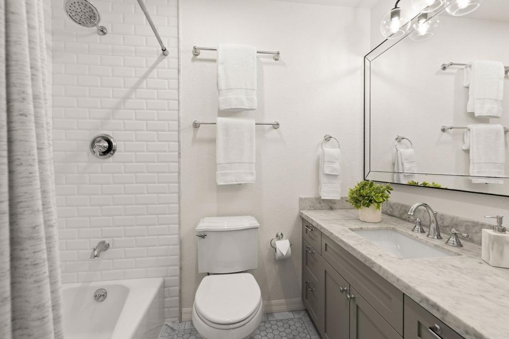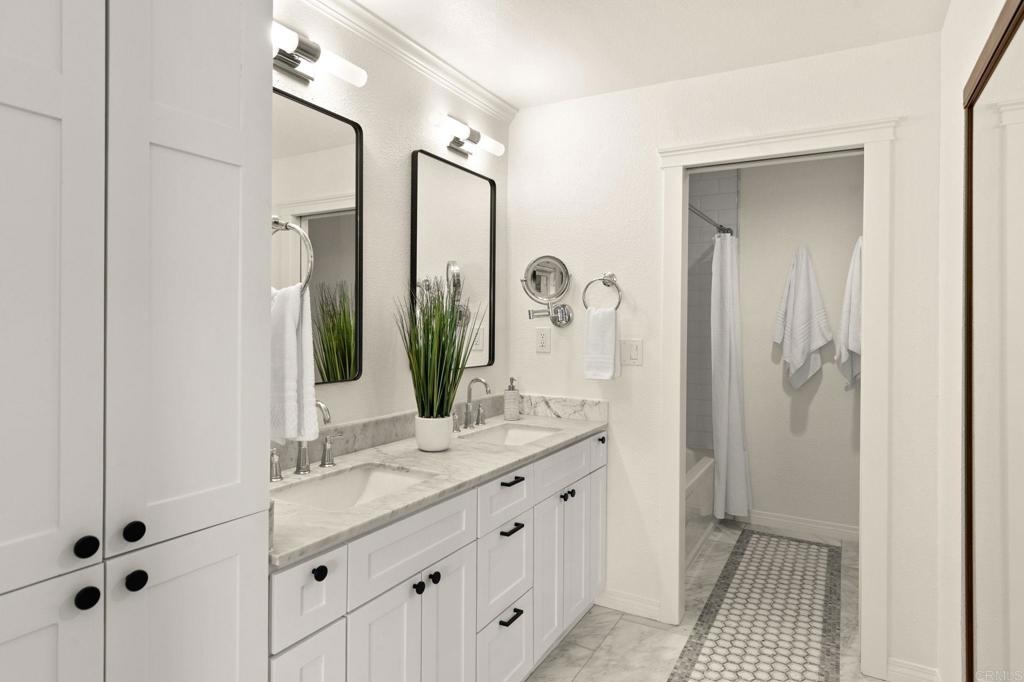 Experience the ultimate lock-and-leave lifestyle in this beautifully maintained townhome located within the guard-gated Windemere community atop Mount Soledad. This move-in ready home offers a thoughtful split-level floorplan, soaring ceilings, and an abundance of natural light throughout. The main level is designed for both comfort and entertaining, featuring a spacious living room with dramatic two-story ceilings, hardwood floors, and a Venetian plaster gas fireplace. The adjacent kitchen is equipped with natural stone countertops, premium stainless steel appliances, and bright white cabinetry. A dedicated dining area opens directly to a private patio through a sliding glass door — perfect for indoor-outdoor living. Upstairs, the primary suite is a private retreat with vaulted ceilings, a balcony offering serene mountain views, and a spa-inspired bathroom with marble flooring and countertops, dual vanities, and a generous walk-in closet. The upper level features two large bedrooms with ceilings fans as well as a full bathroom in the hallway. Additionally, the home features Central AC, an oversized storage room, and an attached two-car garage with epoxy floors, built-in cabinetry, and a side-by-side washer and dryer. Windemere offers a rare blend of resort-style amenities and natural beauty. Residents enjoy 24-hour gated security, two pools and a spa, five tennis courts, four pickleball courts, a basketball half-court, racquetball court, soccer field, dog park, playground, fitness center, saunas, walking trails, and more—all nestled within lush, parklike grounds. HOA dues include access to all recreational facilities, exterior landscaping, water (including hot water), sewer, trash, exterior maintenance (including roof and siding), termite/pest control, and basic structure insurance. Don’t miss out on this exceptional opportunity to enjoy a low-maintenance lifestyle in a vibrant and secure community!