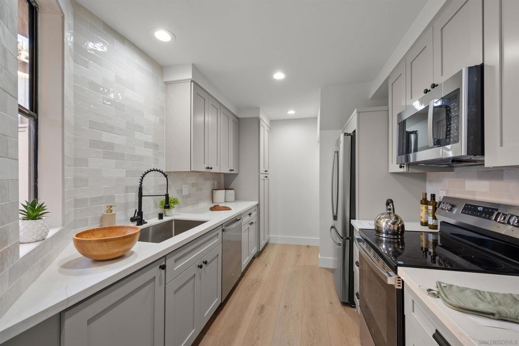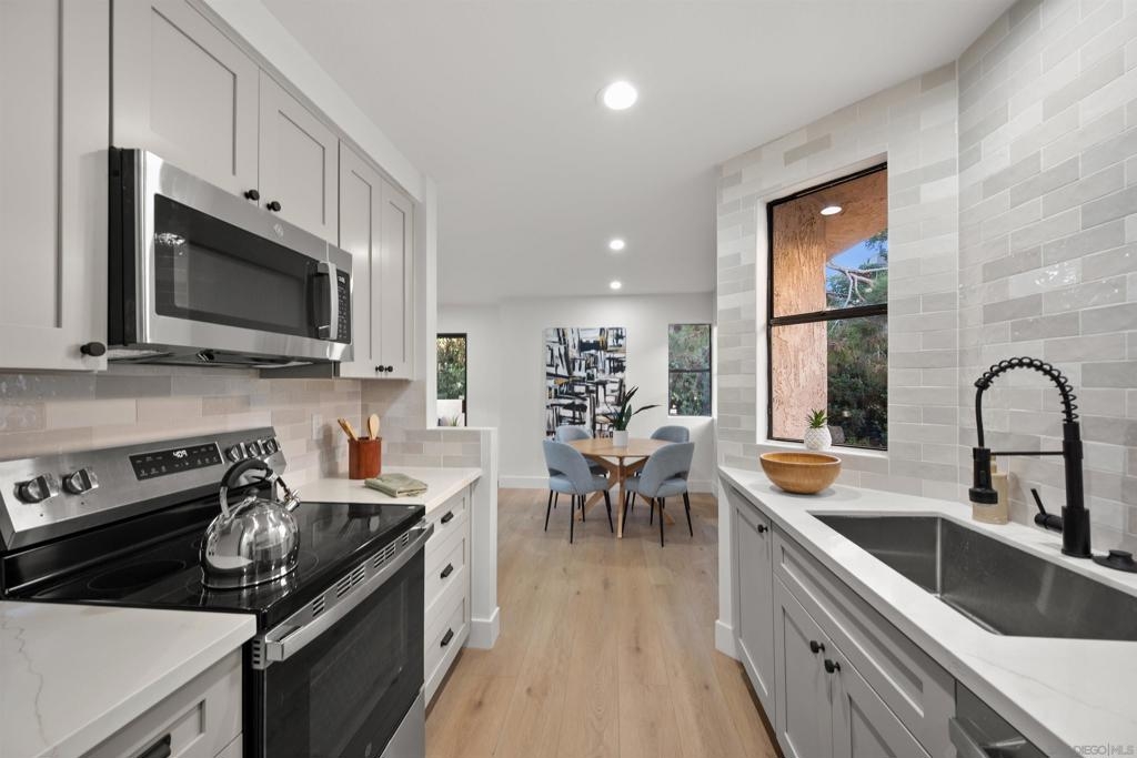 Welcome to this High End complete Remodel located in the sought after Woodlands South community of La Jolla. This end unit offers a spacious living area with a large balcony surrounded by trees creating a private retreat. The kitchen is over the top with soft close cabinets, new appliance's and tile back splash all the way to the ceiling. Both bathrooms have been beautifully remodeled with lots of storage, dual sinks upstairs and a lighted shadowbox for your shampoo. Features new lighting and flooring throughout. This end unit offers a spacious living area with a large balcony surrounded by trees creating a private retreat. The kitchen is over the top with new appliance's and tile back splash all the way to the ceiling. Both bathrooms have been beautifully remodeled with lots of storage, dual sinks upstairs and a lighted shadowbox for your hair products. Features new lighting and flooring throughout. Extra large garage and 2 parking permits. Milgard widows and sliding glass doors to be installed on arrival. Large park around the corner. Close to All. Come See!