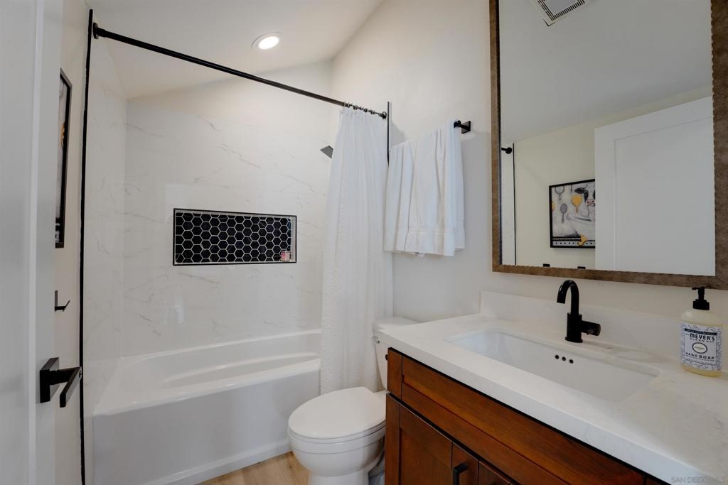 Welcome to this modern and remodeled La Jolla townhome! Boasting open concept living with a custom kitchen including: waterfall edge countertops, designer backsplash, stainless steel appliances with wine fridge and ample storage. A cozy wood burning fireplace in the living room, pitched ceilings in primary bedroom with an office room attached and custom closet storage. Home includes the convenience of an upstairs stackable washer/dryer unit, brand new dual pane windows/sliders, new security front door and steel front door, new interior solid core doors, new aluminum garage door and new mini split. Enjoy the amenities within the HOA and its convenient location just minutes from the community park, multiple shopping center's, and a 10 minute drive to the beach. This is a must see!