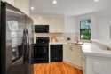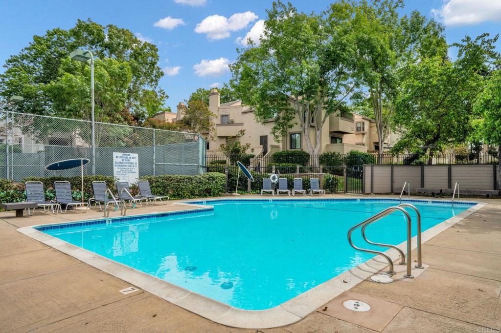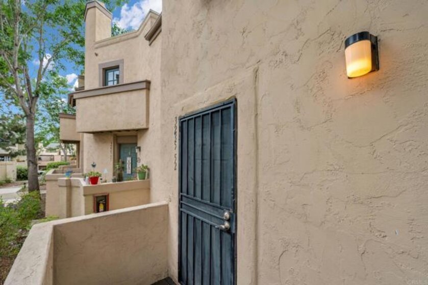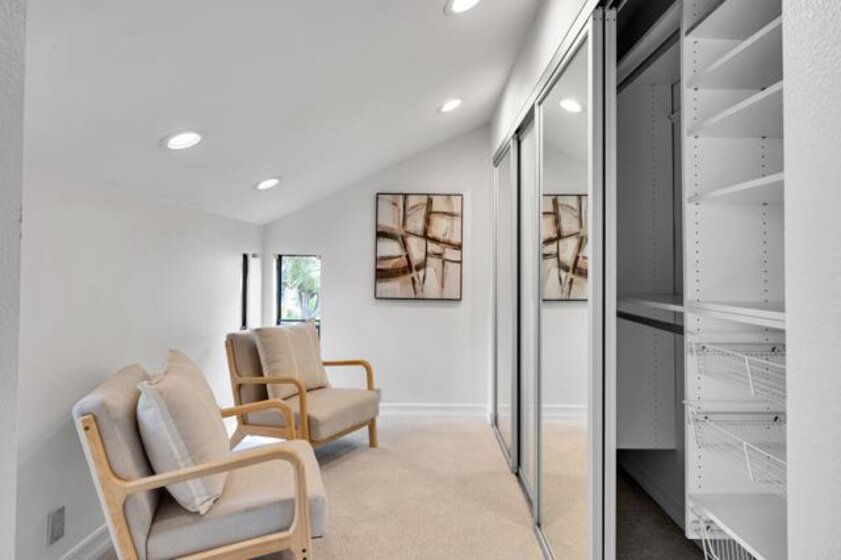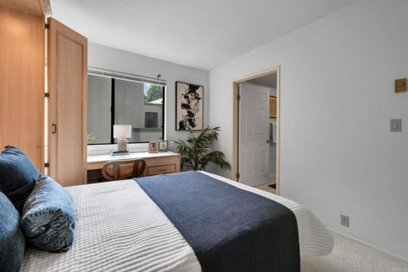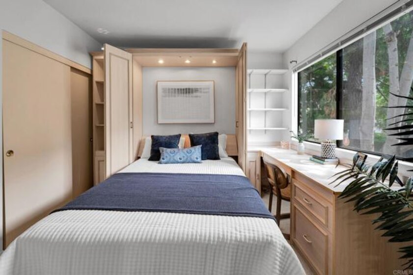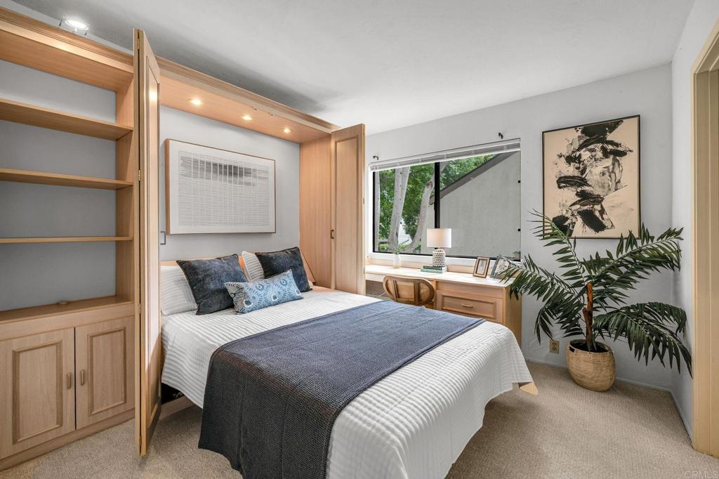 Light & Bright end unit, popular PLAN 5 tucked away in a quiet corner of the complex with a beautiful surrounding greenbelt! Updated gorgeous wood laminate flooring downstairs, and carpet upstairs. Mirrored wardrobe doors, closet organizers, a special alcove off of the primary, for reading, exercising, play area, or a little nursery. A delightfully updated kitchen with quartz counters, wet bar and a wine fridge. The second room has built in shelves, desk and a Murphy bed, and en suite bathroom. Enclosed patio off of main living area, an attached 2.5 car garage, washer & dryer & Guest parking pass. Loads of storage space, upgraded electrical. Community Pool, spa, tennis courts, clubhouse, and greenbelt!