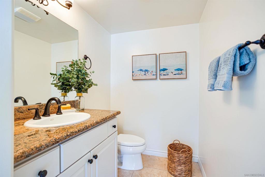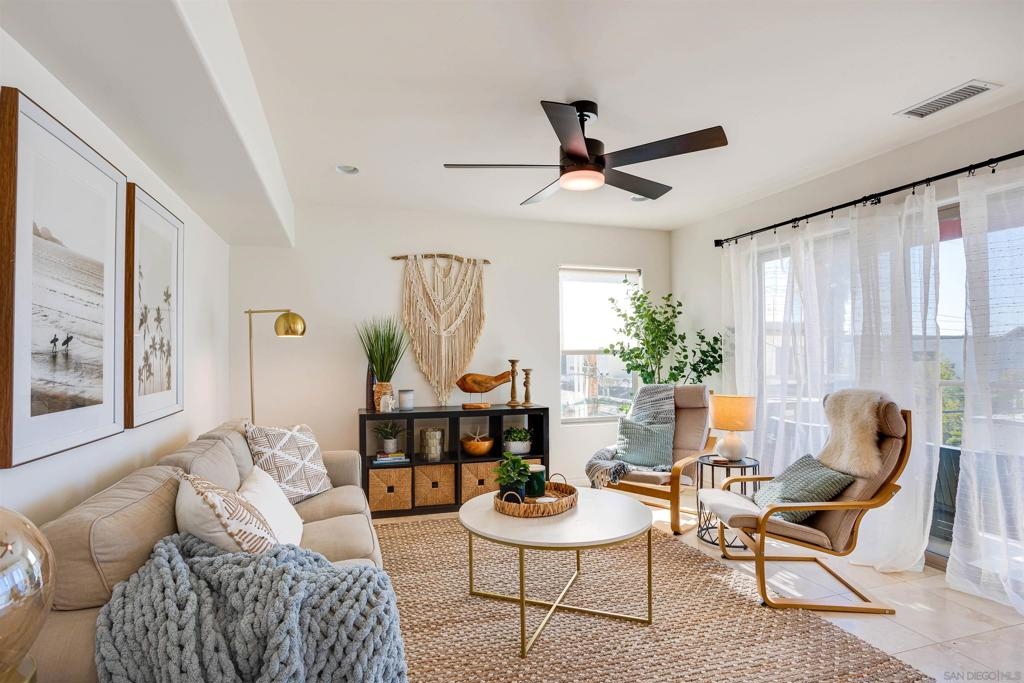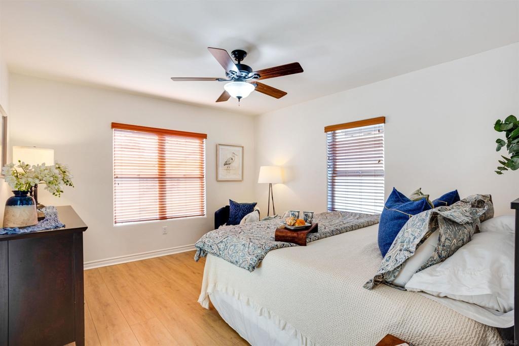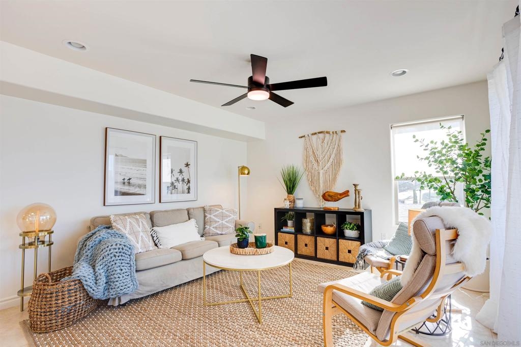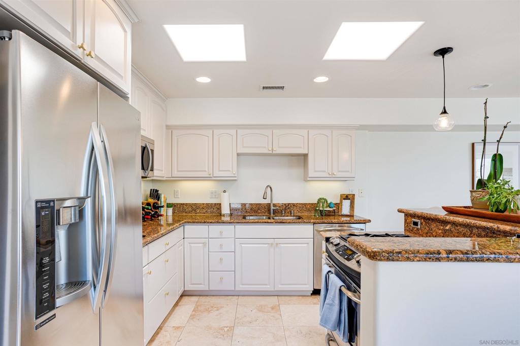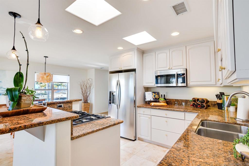 This light and bright town home offers 2 bedrooms, 2.5 bathrooms and an additional flex room. Ocean view from this beautiful Southwest facing condo with luxury vinyl flooring and travertine tile. Stainless Steel appliances, granite counters, 3 skylights, and laundry near the bedrooms. Primary bedroom with walk-in closet, dual vanity and large walk-in shower. Top level of the home provides an ocean view from the windows and balcony. Enjoy incredible sunsets and watch the surfers or join them at Windansea Beach. Located about a 1000 ft from the beach, along with close walking score to many shops and restaurants. An easy bike ride and access to La Jolla Village, Bird Rock and Pacific Beach. A private 2 car tandem garage to store you surf boards and beach chairs. This 4 unit complex has HOA owned Solar, recently painted with in the past year, newer exterior lighting and beautiful landscaping.