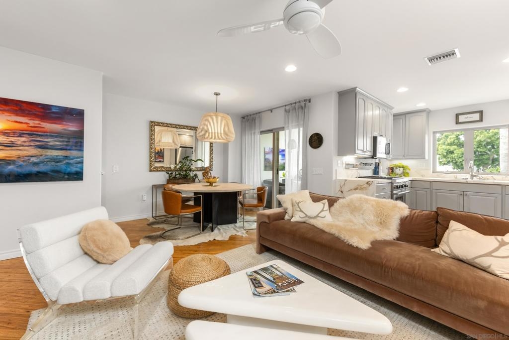 This stunning 3-story condo located in the coveted Windansea Beach is the perfect opportunity to own a primary residence with the flexibility of short-term rentals. Featuring a modern and casual esthetic this home offers 2 bedrooms plus an optional 3rd bedroom or office, 2.5 bathrooms, and spans across 1529 square feet. Step inside to discover a newly remodeled kitchen featuring porcelain countertops, freshly painted cabinets with Hansgrohe faucet with new hardware, and a suite of stainless steel appliances including a Wolf stove, Bosch dishwasher and Refrigerator, and GE microwave. The kitchen also includes a Delta glass rinser and a reverse osmosis system, making it a chef's dream. Eucalyptus wood floors grace the main floor and primary hallway, while polished travertine floors adorn the first floor, bathrooms, and kitchen.This home offers three patios, including a covered patio with a heater, an open-air patio off the primary bedroom on third floor, and an entry patio, providing ample outdoor space to relax and savor the ocean breeze. The primary suite has been newly renovated with porcelain countertops, a refinished tub, new Moen faucets on double sinks, and a bidet seat. Additionally, California Closets organization has been added to the primary bedroom closet.The first floor features a queen bedroom with custom California Closets, plus an office with a built in Murphy bed with newly installed can lighting, which can serve as an optional third bedroom or office. See Supp. A new bathroom vanity has been added in the downstairs bedroom, enhancing its functionality and style.The middle floor is designed for entertaining, with a fully equipped kitchen, cozy family room, dining area, and a balcony. Approx. 1000 feet from the beach, this condo is perfect for beach lovers looking to soak up the sun and surf. Explore the nearby La Jolla Village, La Jolla Cove, La Jolla Shores, and Bird Rock for a variety of amazing retail stores and restaurants. Additional features of this home include custom blinds throughout, air conditioning, a new tankless hot water heater, and a 240-volt Tesla charger in the attached garage. The property also benefits from new exterior high-end paint, owned solar panels by the HOA, and heavy-duty metal storage throughout the garage, and two California Closets locking cabinets providing ample storage space.With its prime location and an array of modern amenities, this home offers the perfect blend of coastal living and contemporary comfort. Don't miss the opportunity to make this historic surf beachside retreat your own.