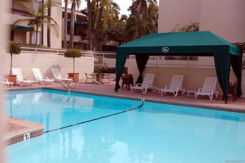 Villa La Jolla 2nd floor end unit overlooking pool in south building. Pleasant outlook with ocean peeks. Sunny & breezy west facing but not on boulevard. Unit needs an update. It's a little tired and dirty. Heated pools, spas, saunas, exercise room, two clubhouses & five laundry rooms. Condo is near elevator & trash chute Two blocks to sandy Windansea Beach. Bus stop is right in front of complex. Easy level walk to the Village or to Bird Rock shops & restaurants. With a little work this will be a great place to call home. Complex Features: ,,,,,, Equipment: Range/Oven Sewer: Sewer Connected, Public Sewer Topography: LL,GSL