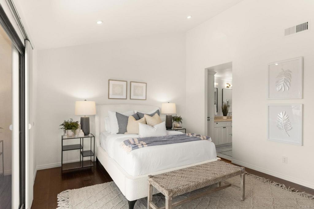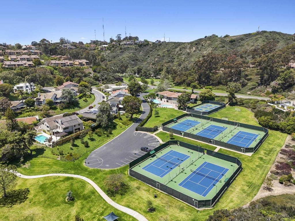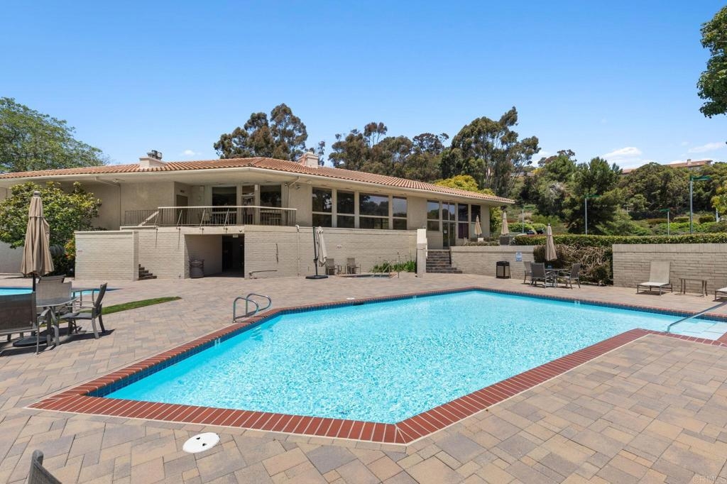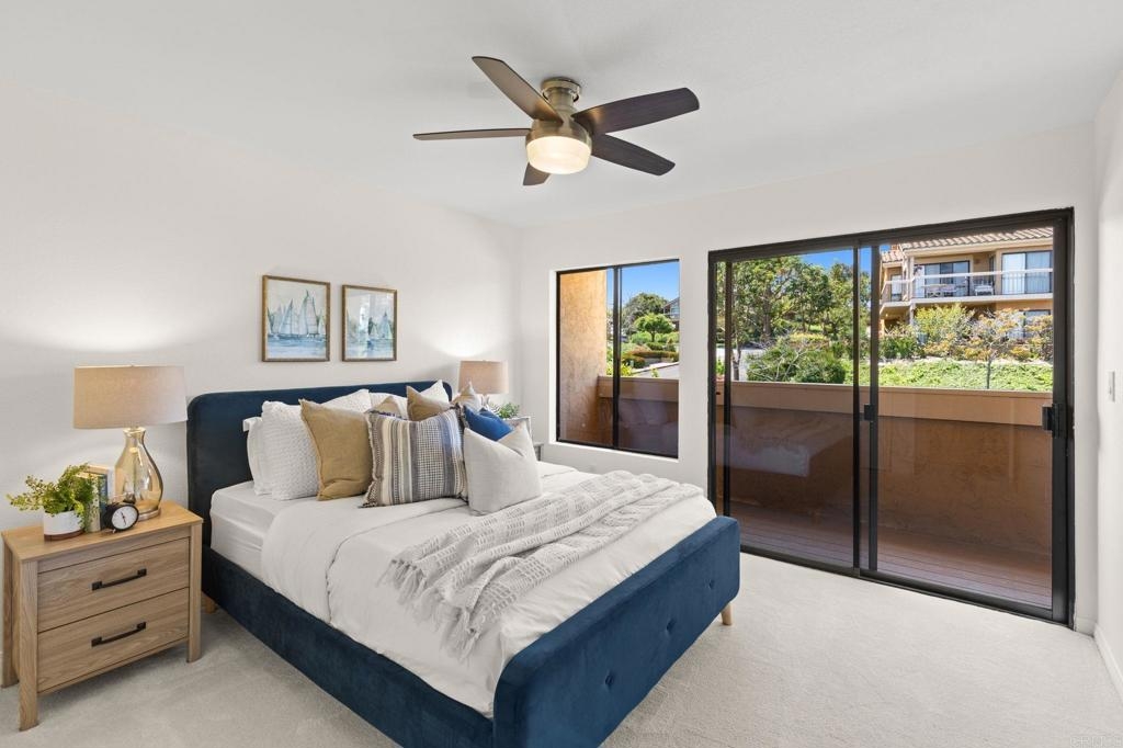 Experience the ultimate lock-and-leave lifestyle in this beautifully maintained townhome located within the guard-gated Windemere community atop Mount Soledad. This move-in ready home offers a thoughtful split-level floorplan, soaring ceilings, and an abundance of natural light throughout. The main level is designed for both comfort and entertaining, featuring a spacious living room with dramatic two-story ceilings, hardwood floors, and a Venetian plaster gas fireplace. The adjacent kitchen is equipped with natural stone countertops, premium stainless steel appliances, and bright white cabinetry. A dedicated dining area opens directly to a private patio through a sliding glass door — perfect for indoor-outdoor living. Upstairs, the primary suite is a private retreat with vaulted ceilings, a balcony offering serene mountain views, and a spa-inspired bathroom with marble flooring and countertops, dual vanities, and a generous walk-in closet. The upper level features two large bedrooms with ceilings fans as well as a full bathroom in the hallway. Additionally, the home features Central AC, an oversized storage room, and an attached two-car garage with epoxy floors, built-in cabinetry, and a side-by-side washer and dryer. Windemere offers a rare blend of resort-style amenities and natural beauty. Residents enjoy 24-hour gated security, two pools and a spa, five tennis courts, four pickleball courts, a basketball half-court, racquetball court, soccer field, dog park, playground, fitness center, saunas, walking trails, and more—all nestled within lush, parklike grounds. HOA dues include access to all recreational facilities, exterior landscaping, water (including hot water), sewer, trash, exterior maintenance (including roof and siding), termite/pest control, and basic structure insurance. Don’t miss out on this exceptional opportunity to enjoy a low-maintenance lifestyle in a vibrant and secure community!