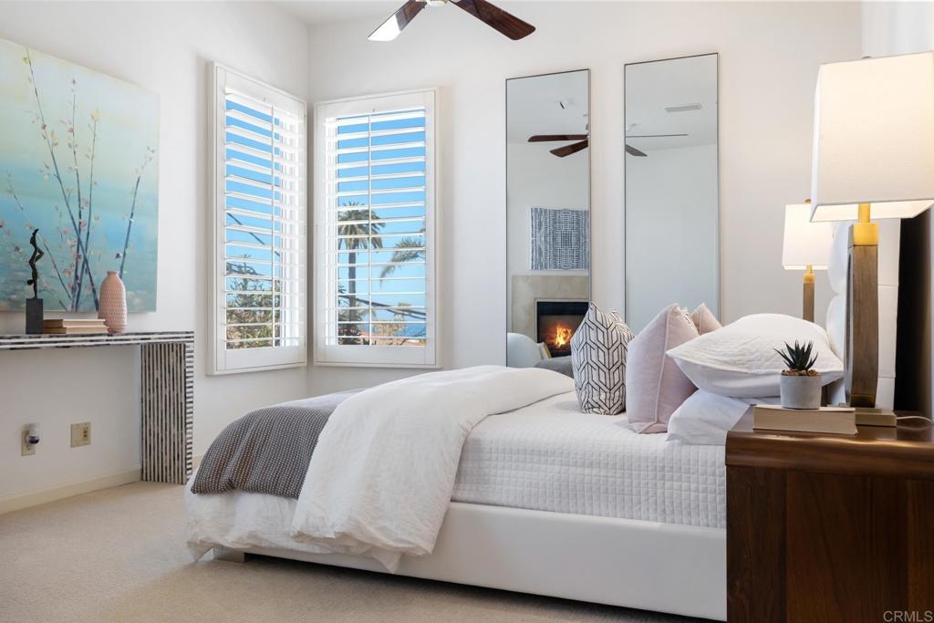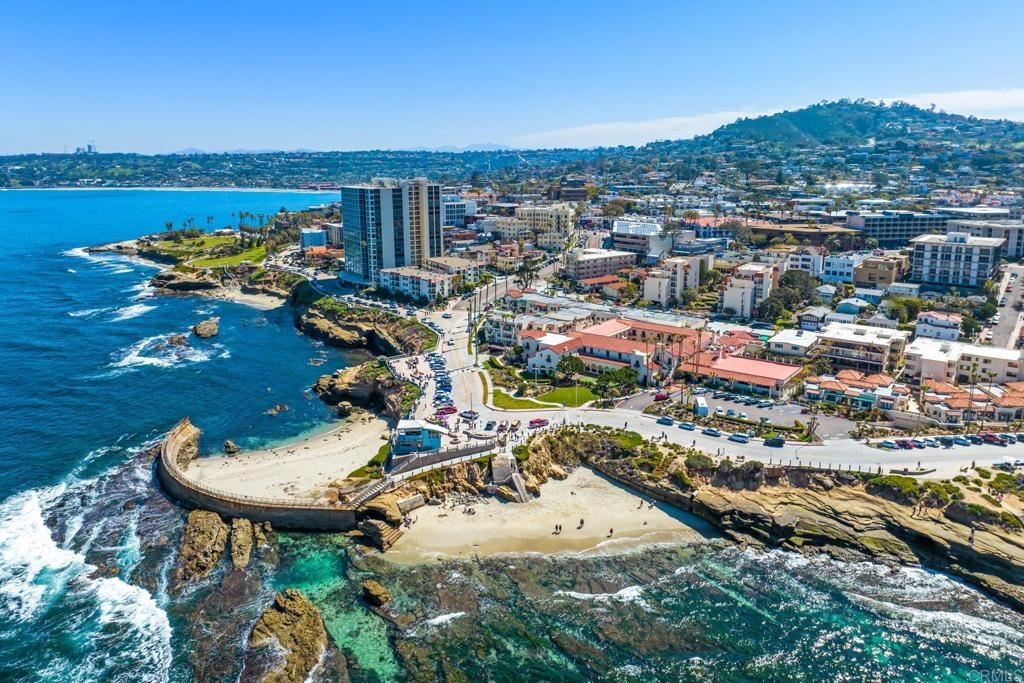 Experience the enchanting Village of La Jolla in this spacious, top-floor condo, located just a short 2.5 blocks from the ocean. With its private, gated entry and interior elevator, this oversized 3-bedroom, 2.5-bathroom condo offers the convenience of single-story living. Enjoy partial ocean views from the primary bedroom and office, while the large, private rooftop deck provides panoramic views of the ocean, village, and surrounding hills—a perfect setting for entertaining. Inside, the soaring ceilings, abundant windows, and skylights create a serene environment flooded with natural light. The primary bedroom features ocean views, walk-in closets, a cozy fireplace, double sinks, a jetted bathtub, and an oversized shower. The middle bedroom has been cleverly converted into a functional office, boasting three walls of built-in shelving. The third bedroom comes complete with an ensuite bathroom. For added convenience, there's an attached two-car garage with alley access. Within walking distance, you'll find world-class restaurants, shopping venues, parks, museums, and art galleries, ensuring endless entertainment and exploration. Additionally, pending at the seller's expense, the installation of solar panels further enhances the property's eco-friendliness.