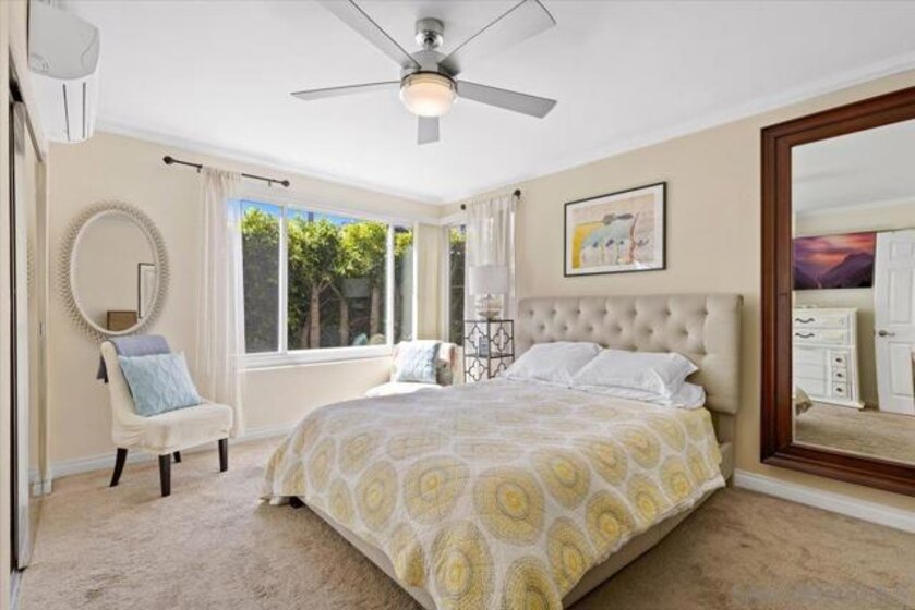 Spectacular location, in the heart of La Jolla Village, this perfectly situated, first floor condominium is just steps from renowned restaurants, boutique shops, world class art galleries and a multitude of coastal attractions. Stepping inside the architecturally unique, curvilinear entry way you are immediately greeted by the open concept living, dining, kitchen, great room with sliding doors that lead you to the common patio/garden space, surrounded by tall ficus trees for privacy. Living space features wall-to-wall picture window to enjoy your quintessential La Jolla coastal views, including the iconic La Valencia Hotel, and the classic palm tree lined Coast Walk that graces Ellen Browning Scripps Park, all of this plus views of the blue Pacific Ocean all the way up the coast past the bluffs of Blacks Beach. Large windows in each room let in the natural sunlight. Hardwood flooring in the main areas and carpet in the bedrooms. Kitchen features stainless appliances, dual corner sinks, electric stove, and spacious pantry. Stacked washer and dryer in unit. 2 mini-split systems for immediate cooling and heating, and an additional 3 ceiling fans. Don't pass up this opportunity to be on a vacation 24/7, 365 days a year!