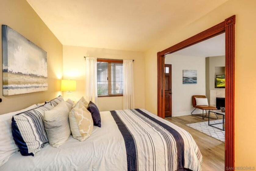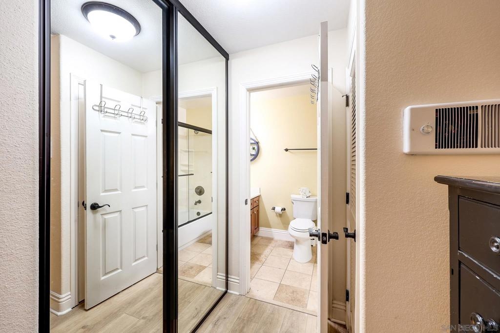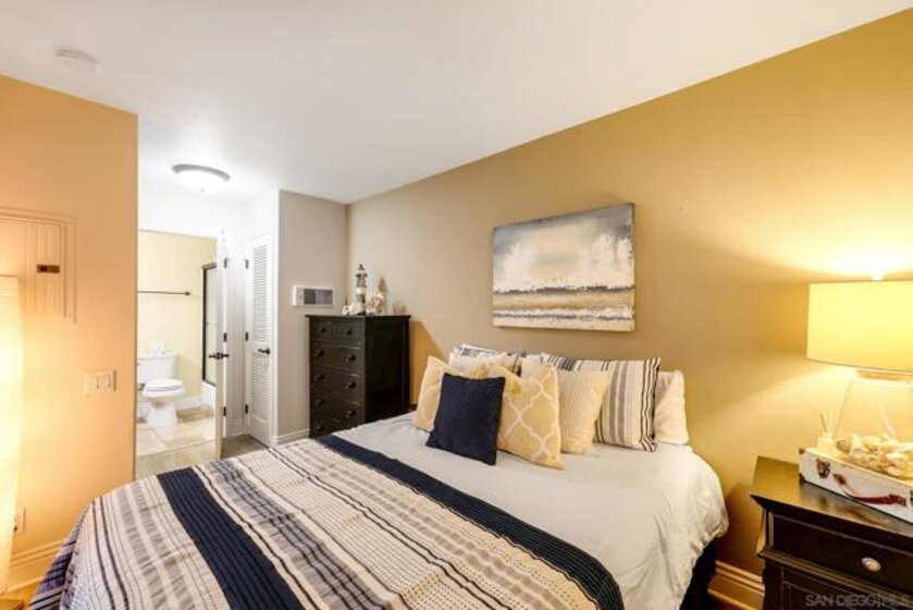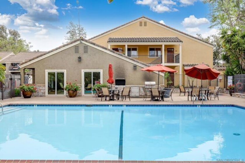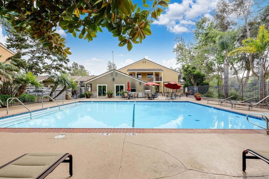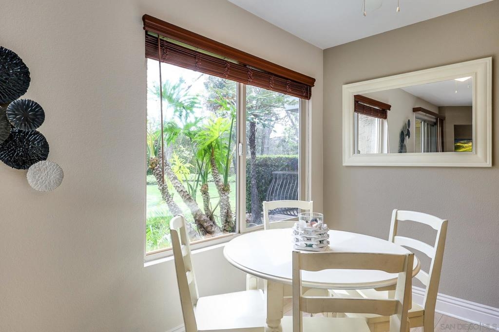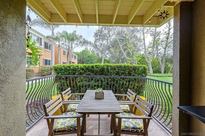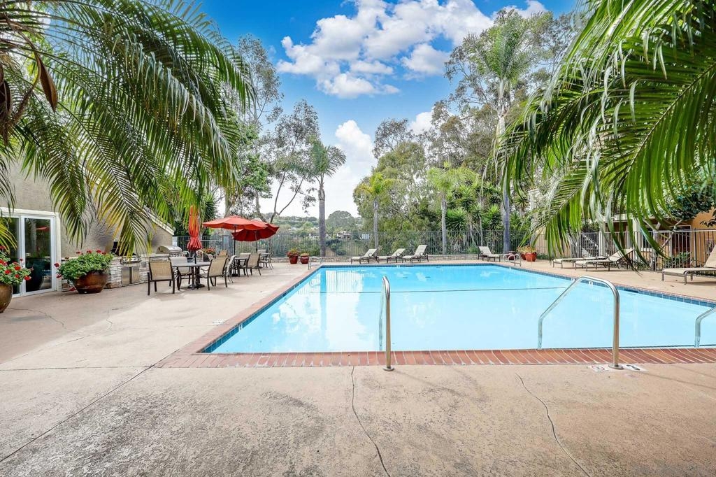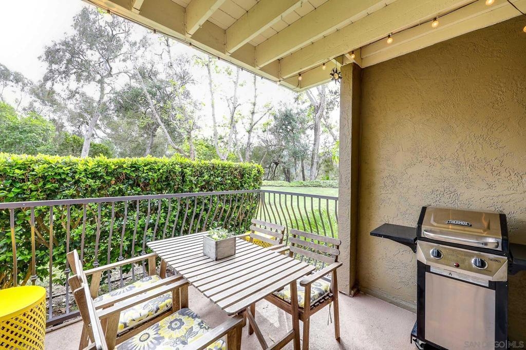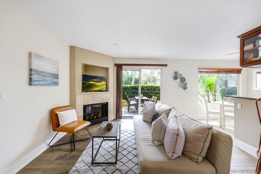 Beautifully maintained corner residence in the highly desirable La Jolla Village neighborhood, ideally situated next to a peaceful green belt and offering a perfect blend of comfort and convenience. This inviting home features a bright, open layout with warm wood cabinetry, granite countertops, and a functional breakfast bar that seamlessly connects the kitchen to the living space. The cozy living room is centered around a charming fireplace and opens to a private outdoor patio through sliding glass doors—ideal for relaxing or entertaining while enjoying lush, green surroundings. The patio also features a convenient closet with in-unit stackable washer and dryer, adding everyday ease and functionality. The bathroom is well-appointed with ample storage and a clean, classic design. Residents enjoy access to resort-style amenities including a sparkling pool, sun deck, and outdoor gathering areas surrounded by mature trees and tropical landscaping, creating a peaceful retreat-like setting. Ideally located near world-class beaches, shopping, dining, and easy freeway access, this home offers the best of coastal La Jolla living.