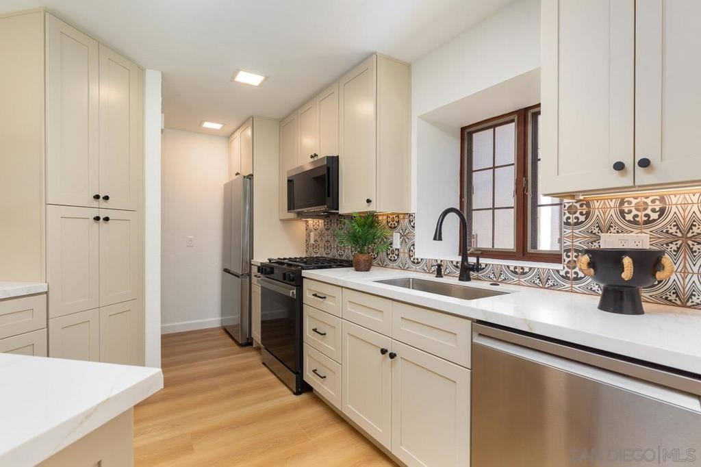This beautifully renovated, Spanish contemporary townhome is located in the highly desirable Villas Mallorca community of La Jolla. Enjoy views of the lush tropical landscape from windows on three sides of this bright, spacious, end unit floor plan. Highlights of this 2 bedroom, 2 1/2 bath townhome include high end finishes and upgrades throughout, new kitchen, appliances, bathrooms, and flooring. Ideal location close to all that La Jolla has to offer with easy freeway access and endless shopping/dining amenities across the street.